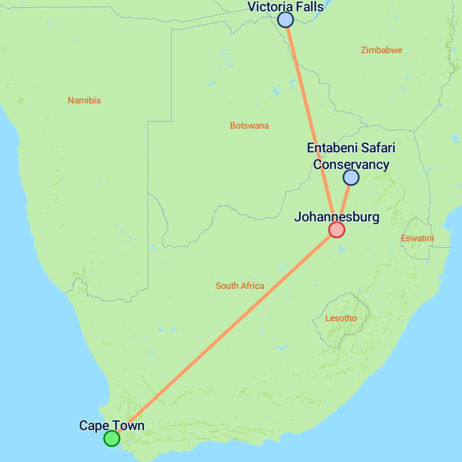 Experience ten unforgettable days travelling from Cape Town to Victoria Falls, blending coastal charm, wildlife adventure and natural wonder. You’ll have time to discover Cape Town at your own pace, with optional outings to Table Mountain, Robben Island, the Cape Peninsula and the Winelands. Continue to the Entabeni Safari Conservancy for classic Big Five game drives before an overnight stop in Johannesburg. The journey ends in Victoria Falls, where a Zambezi sunset cruise and a guided walk to the Falls deliver a spectacular finale. A balanced mix of leisure, culture and safari highlights awaits.