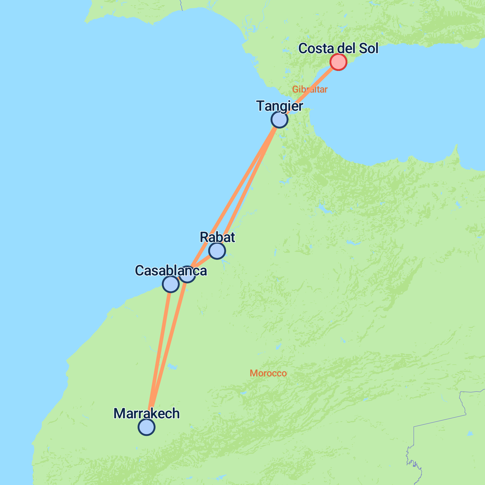 Set off on a five-day adventure from Spain’s sunny Costa del Sol to Morocco’s vibrant cities and back again. Cross the legendary Strait of Gibraltar to explore Tangier’s souks, Rabat’s grand monuments and Casablanca’s oceanfront charm. Discover Marrakesh in depth, from its ornate palaces and lively Jemaa el Fna Square to the colours of its bustling souks. Journey north via Mohammedia’s coastal views before returning across the strait to Spain. With a mix of history, culture and coastal scenery, this tour offers an unforgettable taste of Morocco’s magic in just a few days.