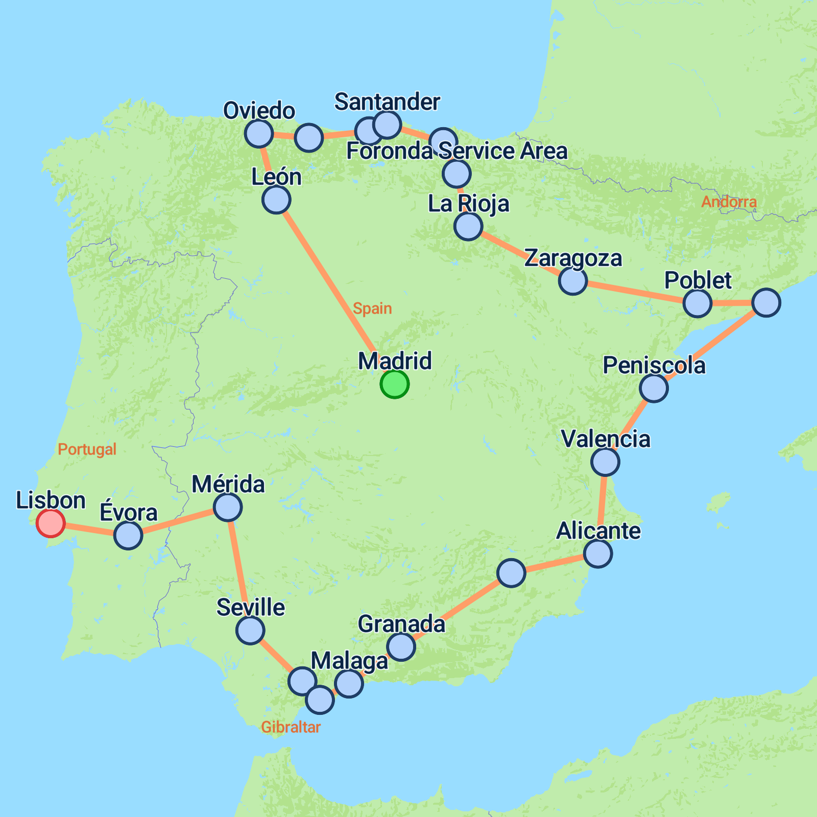 Embark on a captivating 14-day journey from Madrid to Lisbon, offering an enchanting mix of history, culture, and scenic beauty. Begin in the bustling capital of Spain and traverse the picturesque landscapes of Castile and Asturias to the vibrant city of Oviedo. Explore the medieval majesty of Santillana del Mar, the artistic allure of Bilbao, and the wine-rich region of La Rioja. As you head south, immerse yourself in Barcelona's vibrant atmosphere, Valencia's rich heritage, and the Moorish wonders of Granada. Finish your adventure in Portugals charming capital, Lisbon. Expect stunning architecture, delicious cuisine, and unforgettable memories.