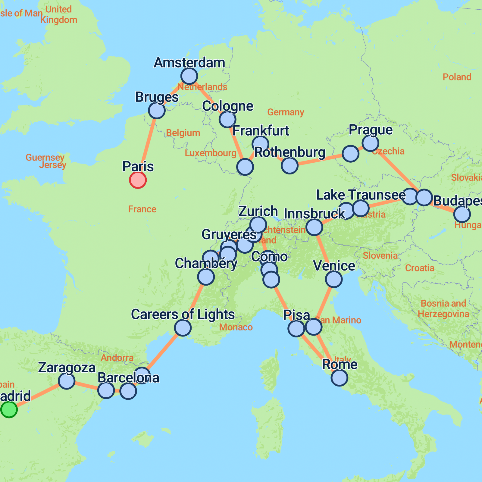 Set off from vibrant Madrid on this 24-day European adventure, concluding in the enchanting city of Paris. Discover the bustling night scene and iconic landmarks of Spain, including a visit to Real Madrid's stadium. Wander through medieval Zaragoza and serene Poblet, then on to Barcelona's architectural wonders. Cross into France and immerse yourself in Arles' artistic heritage and the captivating Carrires des Lumires. Journey through Switzerland's chocolate delights, dramatic glacier views, and picturesque Lucerne. Explore Milan, Pisa, and Rome's historic wonders, then delight in Florence's art and Venice's charm. From Salzburg's musical legacy to Prague's elegance, and Amsterdam's idyllic windmills to Bruges' medieval charm, this tour showcases Europe's diverse cultures and breathtaking landscapes. Conclude in Paris with a visit to the Eiffel Tower and serene Seine cruise, leaving you with unforgettable memories.