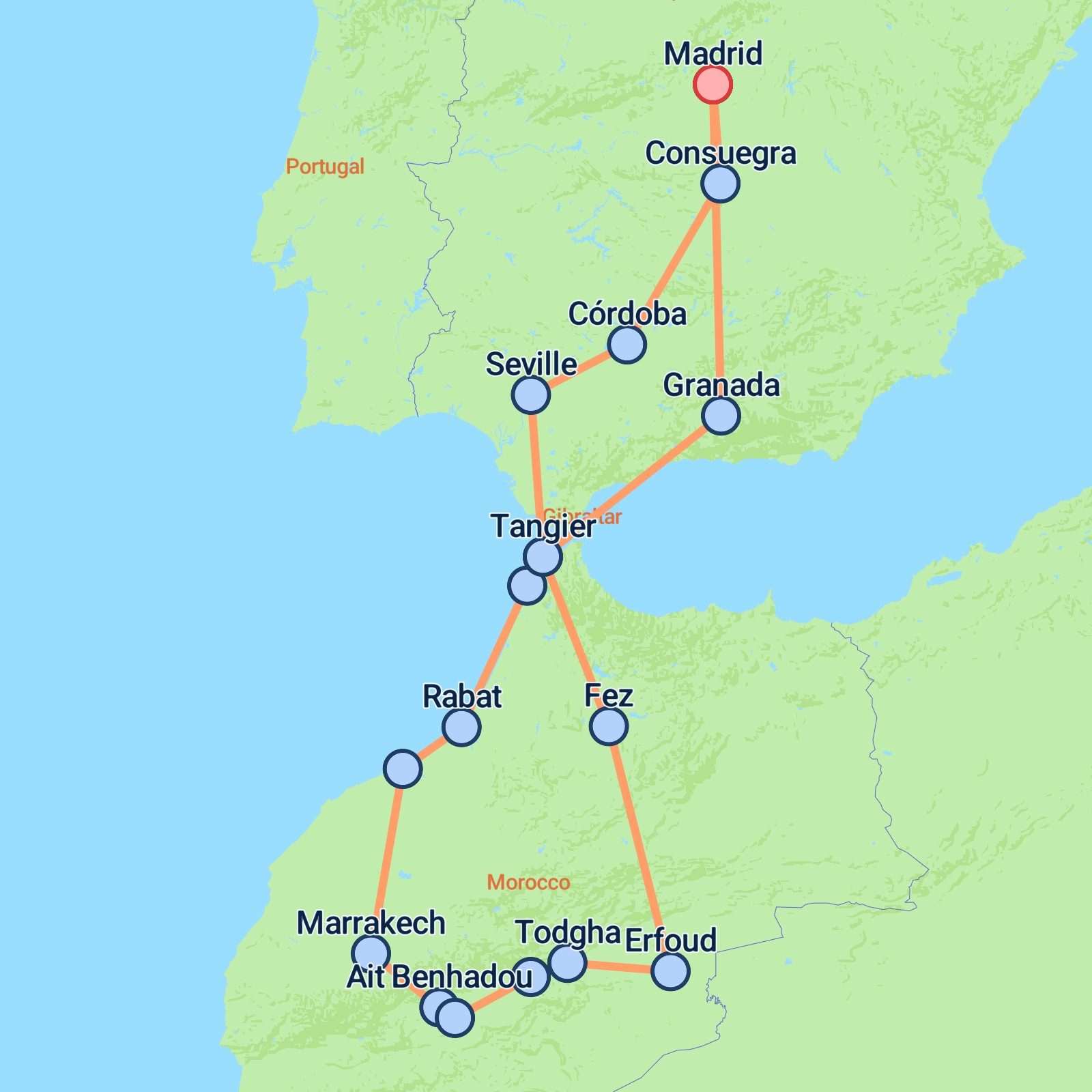 Embark on a captivating 14-day adventure starting and ending in Madrid. Discover the vibrant culture of Spain and Morocco as you wander through iconic cities and stunning landscapes. Begin with the lively nightlife and historical wonders of Madrid. Journey south to the enchanting Alhambra in Granada, then ferry across to Morocco for the bustling medinas of Marrakech and the serene desert landscapes around Erfoud. Cross back to Spain for a taste of Andalusian charm in Seville and Crdoba. Highlights include exploring the maze-like streets of Fez, traversing the Atlas Mountains, and marvelling at Consuegra's windmills. A perfect blend of history, culture, and breathtaking scenery awaits.