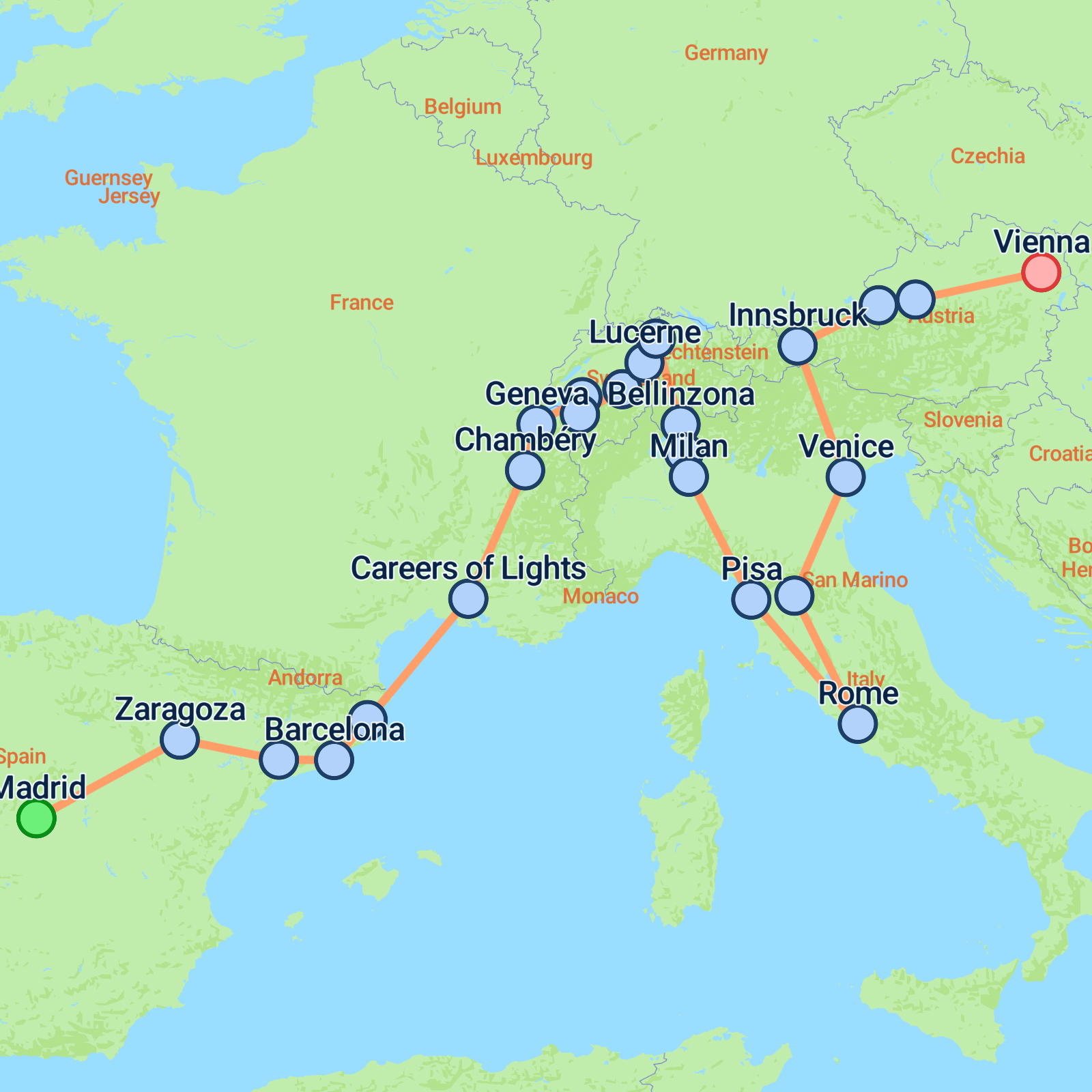 Kick off your 16-day European adventure in the vibrant city of Madrid and conclude in Vienna, the Austrian capital full of imperial grandeur. Your journey begins in Madrid, with its intoxicating mix of tapas and nightlife, followed by explorations of iconic landmarks like the Retiro Park and Santiago Bernabu Stadium. Traverse the lands of Castile to discover Zaragoza's stunning cathedral and the medieval serenity of Poblet Abbey. In Barcelona, embrace the modernist wonders of Gaud and wander through Girona's ancient streets. From France's charming Chambry to Switzerland's alpine gems and Italy's artistic masterpieces, each day offers a fresh backdrop of culture and history. Round off with the baroque elegance of Salzburg and Viennas splendid boulevards. Expect a blend of leisurely sightseeing, cultural immersion, and picturesque landscapes throughout this unforgettable tour.