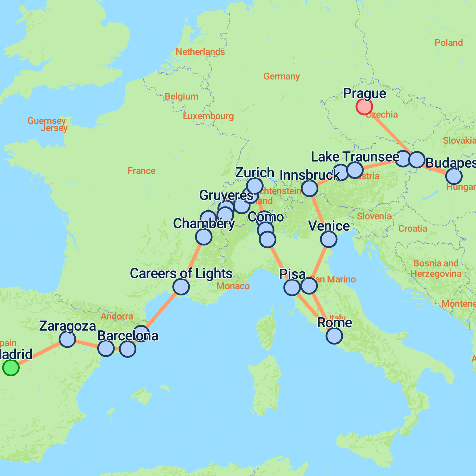 Start your thrilling 19-day European journey in the vibrant city of Madrid and end it with the enchanting charm of Prague. Embark on guided tours of iconic landmarks such as Santiago Bernabu Stadium and the Leaning Tower of Pisa. Discover the wonders of Sagrada Familia in Barcelona and explore Genevas majestic Palais des Nations. Traverse the stunning landscapes of the Alps, enjoying picturesque towns like Salzburg and Bellinzona. Embrace cultural flavours with tours in cities such as Rome, Florence, and Venice. Enjoy the serenity of Lake Traunsee in Austria and a scenic boat ride on Pragues Vltava River. This tour promises diverse cultures, stunning scenery, and unforgettable moments.