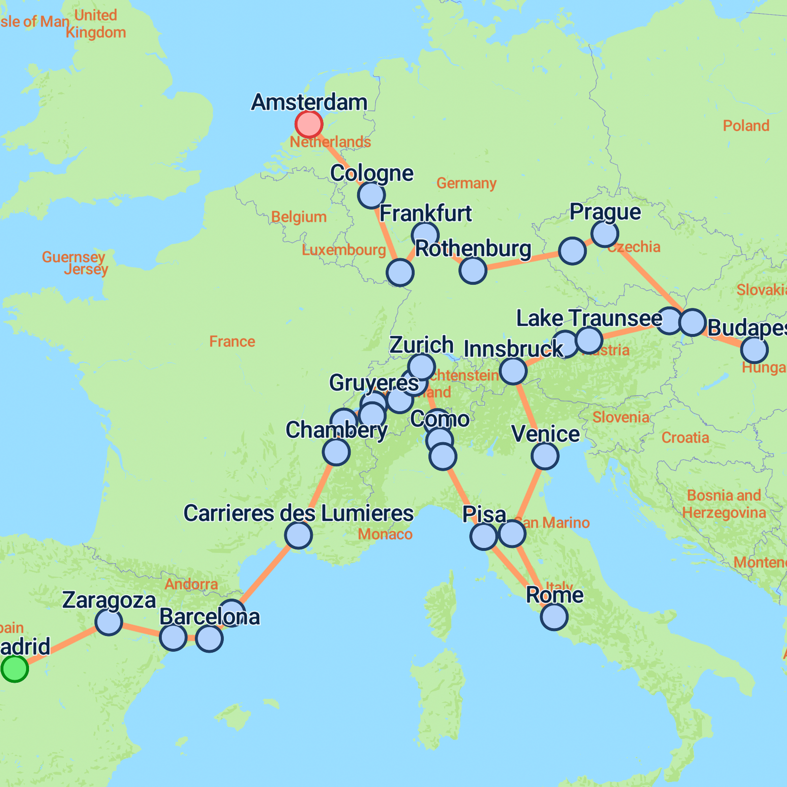 Embark on an unforgettable 22-day adventure beginning in vibrant Madrid and ending in picturesque Amsterdam. Dive deep into the heart of each city, from the architectural wonders of Barcelona and bustling streets of Rome to the alpine beauty of Lucerne and cultural charm of Vienna. Witness unforgettable moments like traversing Glacier 3000 in Switzerland, gliding on the Danube in Budapest, and discovering Amsterdam's iconic windmills. Relish the blend of urban exploration, historical insights, and scenic landscapes. This diverse journey offers a perfect balance of leisure and guided tours, ensuring a memorable and enriching experience.