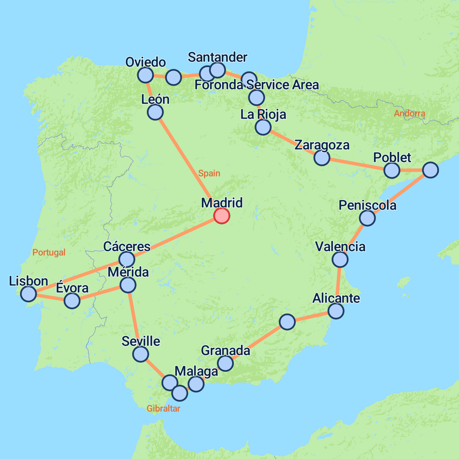 Embark on a captivating 15-day adventure from the vibrant streets of Madrid, culminating in the historic charm of Lisbon. This tour promises an enchanting blend of history, culture, and breathtaking landscapes. Discover the Gothic grandeur of Len's cathedral, explore the medieval beauty of Santillana del Mar, and wander the stunning streets of Barcelona adorned with Gaud's masterpieces. Journey along the scenic Costa del Sol, soak up the sun in charming Valencia and Alicante, and lose yourself in the allure of Granada's Alhambra Palace. As you venture into Portugal, marvel at the ancient architecture of vora before immersing in the lively spirit of Lisbon. Completing the circle, return to Madrid through the picturesque Alentejo and historic Cceres, rounding off an unforgettable journey.