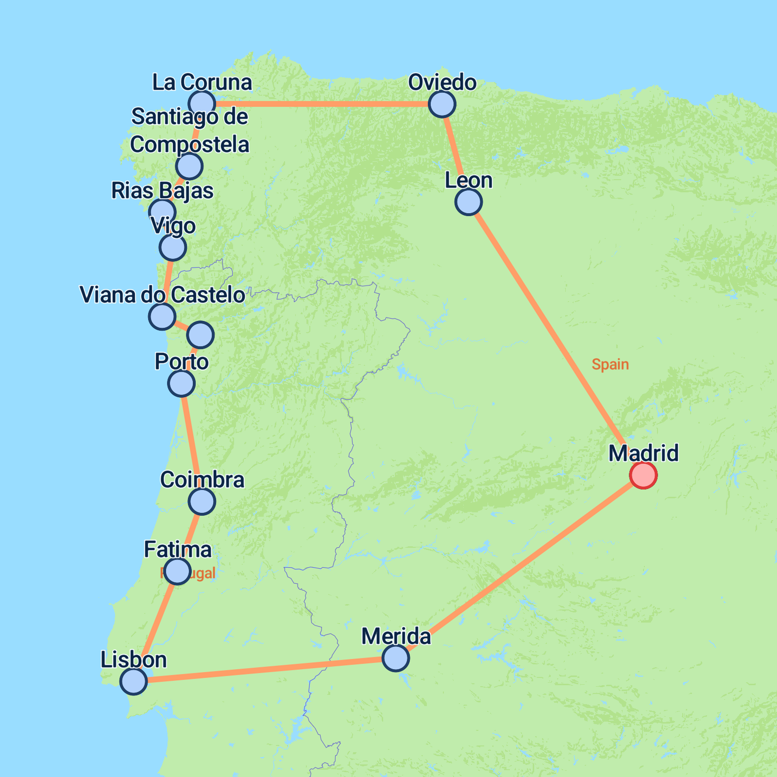 Explore the beauty of northern Spain and Portugal on this 10-day journey from Madrid to Lisbon. Discover León’s Gothic charm and the pilgrimage spirit of Santiago de Compostela before travelling through Galicia’s scenic Rías Bajas. Cross into Portugal to visit the coastal gems of Viana do Castelo and Braga, then enjoy Porto’s riverside views and a tasting of its world-famous wine. Continue to Coimbra, birthplace of Fado, and on to Lisbon, where you’ll tour its historic districts and Belem’s monuments. With culture, history and fine food at every stop, this Iberian adventure is full of unforgettable moments.