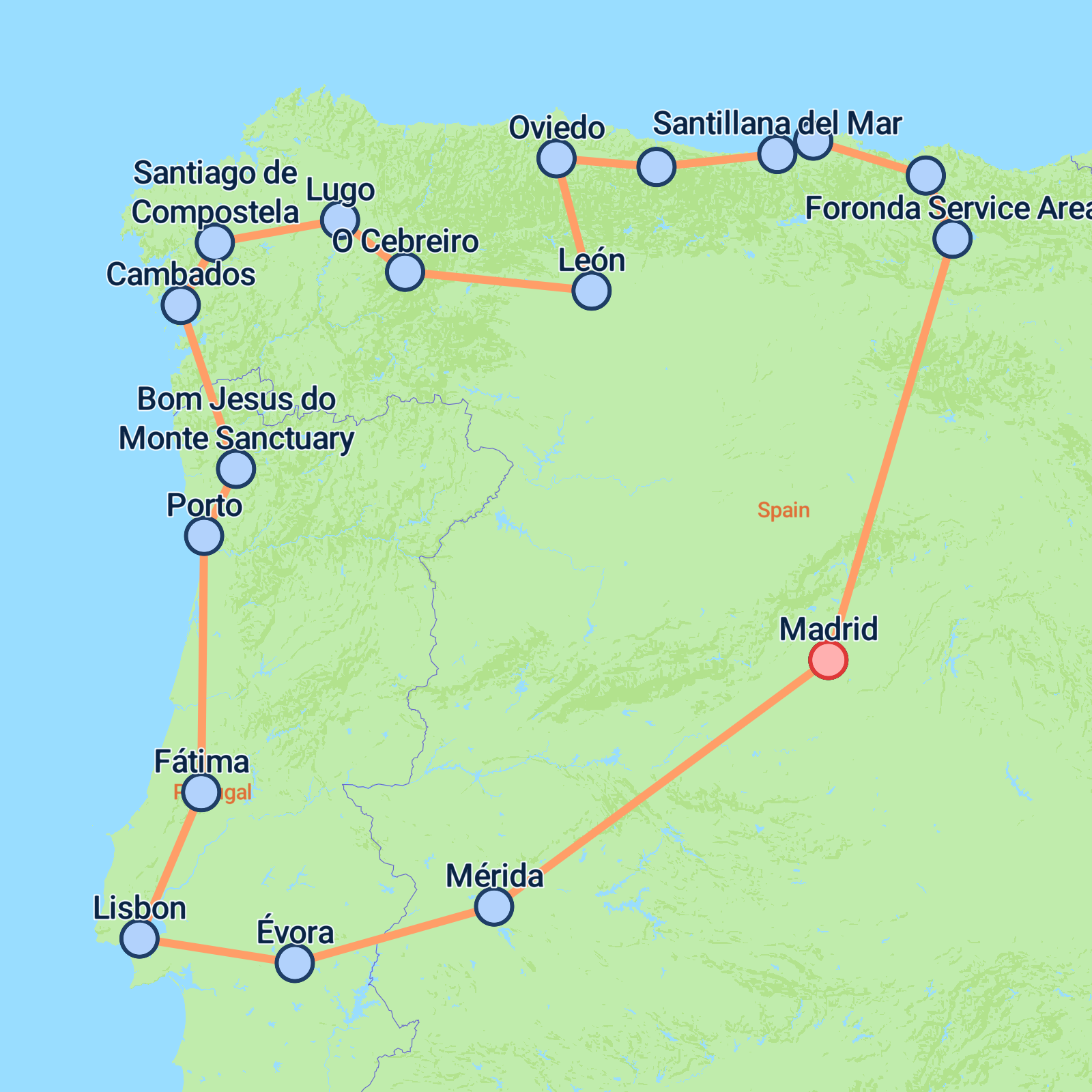 Embark on a captivating 10-day journey from the vibrant city of Madrid to the culturally rich landscapes of northern Spain and Portugal, ending back in the Spanish capital. This tour offers a delightful blend of historic charm and scenic beauty. Begin by exploring Madrids iconic sights and lively plazas, then venture to Mridas Roman ruins and voras picturesque streets. In Lisbon, soak up the Portuguese charm and sail on Porto's Douro River. Discover Galicias culinary delights and the spiritual Camino de Santiago. As you explore the Basque Countrys vibrant Bilbao, expect breathtaking views where mountains meet the sea. A truly unforgettable adventure awaits.