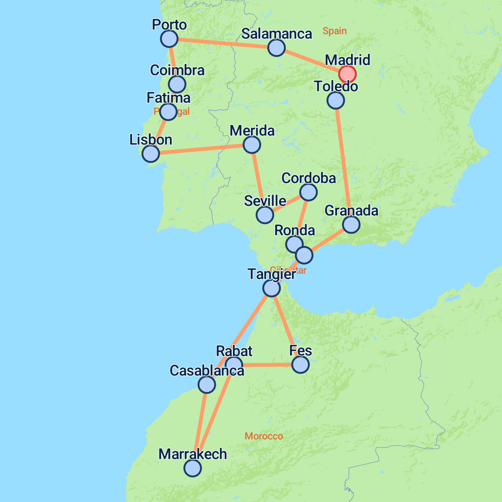 Journey from Madrid on an unforgettable 17-day adventure through Spain, Portugal and Morocco. Explore Salamanca’s golden sandstone streets, sip port in Porto, and stroll through Lisbon’s lively districts before crossing into Andalusia for flamenco-filled nights in Seville and the Moorish splendour of Granada’s Alhambra. Sail across the Strait of Gibraltar to discover Morocco’s imperial cities—Casablanca, Marrakesh, Rabat and Fes—alive with colour, culture and spice-scented souks. Return to Spain via the sunny Costa del Sol and the historic city of Toledo. A perfect blend of history, architecture and vibrant traditions across three captivating countries.