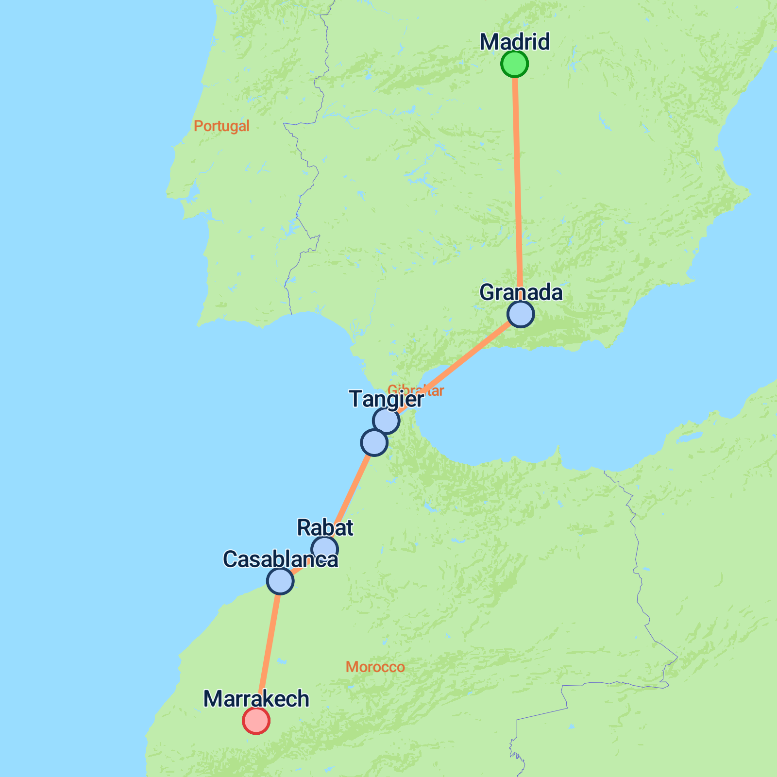 Begin your unforgettable 7-day adventure in vibrant Madrid, exploring iconic spots like Paseo del Prado and Retiro Park. In the evening, dive into the local nightlife at Plaza Mayor with a variety of dining options. Journey south to enchanting Granada, feasting your eyes on the Alhambra Palace and its exquisite gardens. Cross the famous Strait of Gibraltar and find yourself in the vibrant Moroccan city of Asilah. Continue to Rabat, Casablanca, and finally Marrakech, where youll marvel at the bustling Jemaa el-Fnaa square and the historic Bahia Palace. End your journey in the colourful and lively atmosphere of Marrakech, rounded off with an option for a traditional Kalesa ride.