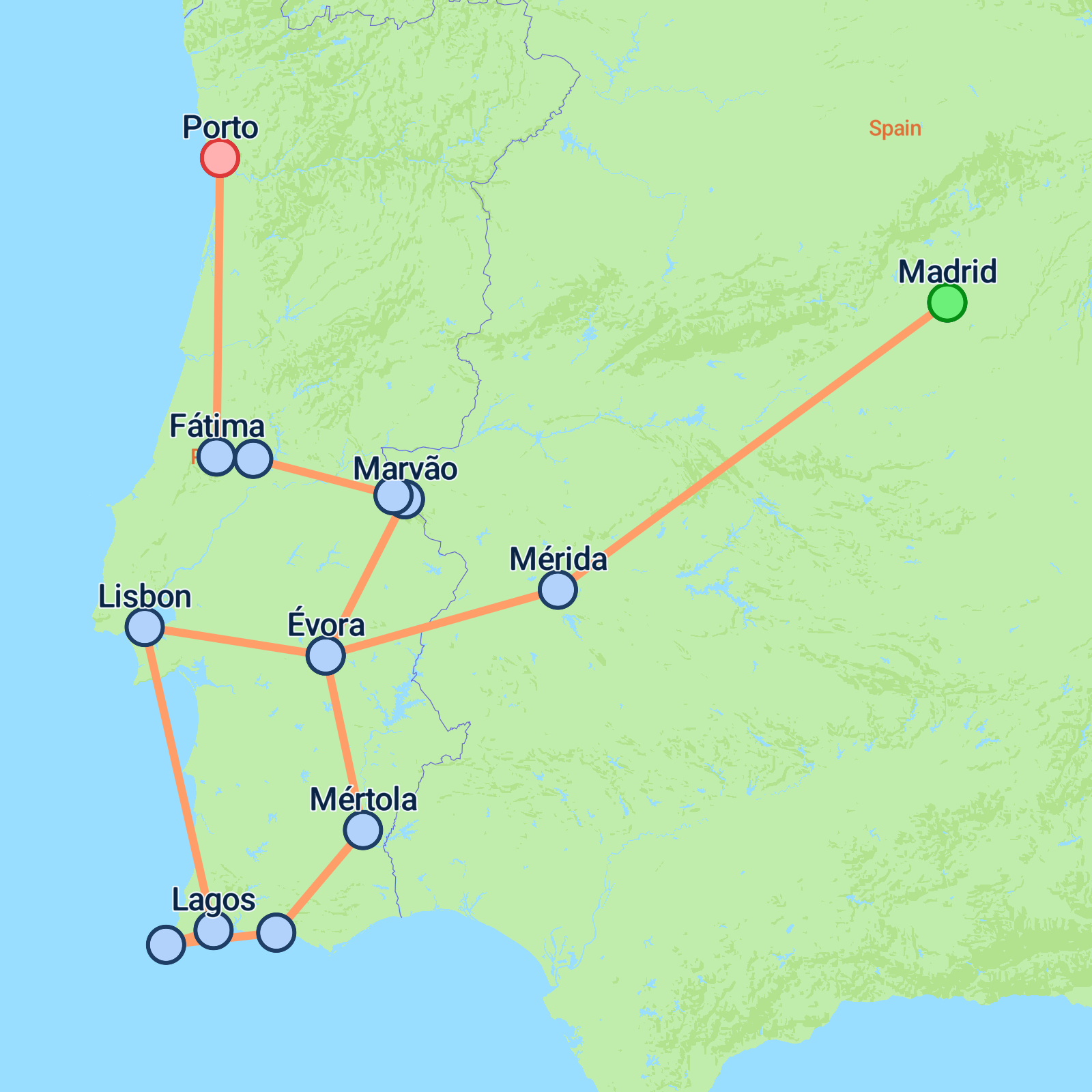 Embark on a captivating 7-day journey from Madrid to Porto, brimming with culture, history, and stunning landscapes. Initially, youll explore Mridas Roman Theatre and the charming streets of vora before arriving in lively Lisbon. Savour the city's vibrant atmosphere and explore Belems historic sights. In the Algarve, experience Lagos historic charm and the windswept cliffs of Cape St. Vincent. Discover Faro's serenity and vora's intriguing Chapel of Bones. Venture through picturesque Marvo and Castelo de Vide's medieval quarters before reaching the spiritual heartland of Ftima. Finally, soak in Portos panoramic views aboard a traditional Douro River cruise. A journey full of unforgettable sights and experiences ends in Porto.