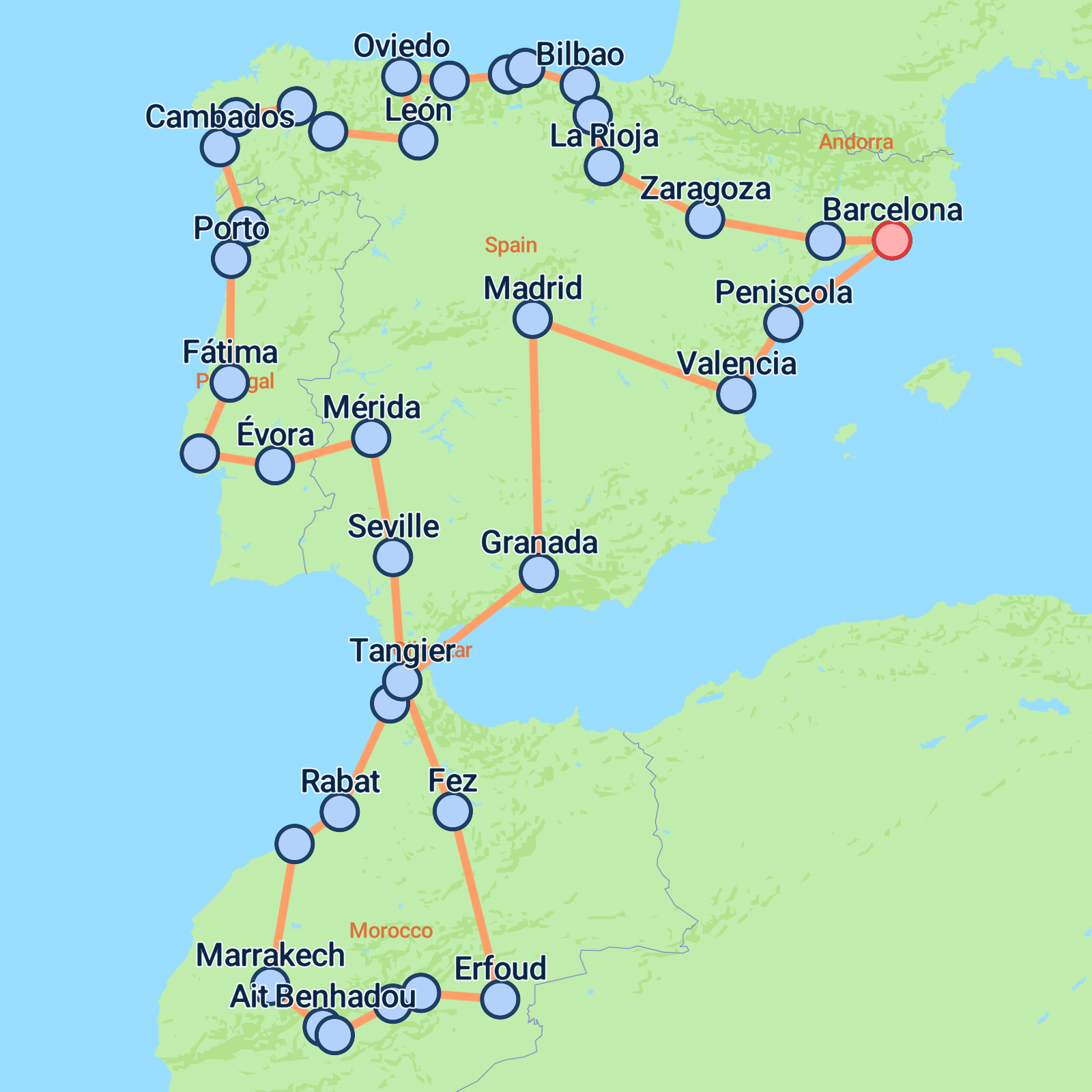 Begin and end your unforgettable 23-day journey in the vibrant city of Barcelona, a bustling hub known for its iconic architecture and lively atmosphere. This tour takes you through the heart of both Spain and Morocco, offering a whirlwind of experiences. In Spain, explore the stunning landscapes of Galicia and the historic charm of Seville, and delve into the rich heritage of Madrid. As your journey continues through Morocco, expect to see the captivating Medina of Fez, the scenic Atlas Mountains, and the enchanting streets of Marrakech. Meandering through Portugal, savour the delights of Lisbon and the Douro River in Porto. This tour is a perfect blend of culture, scenery, and history.
