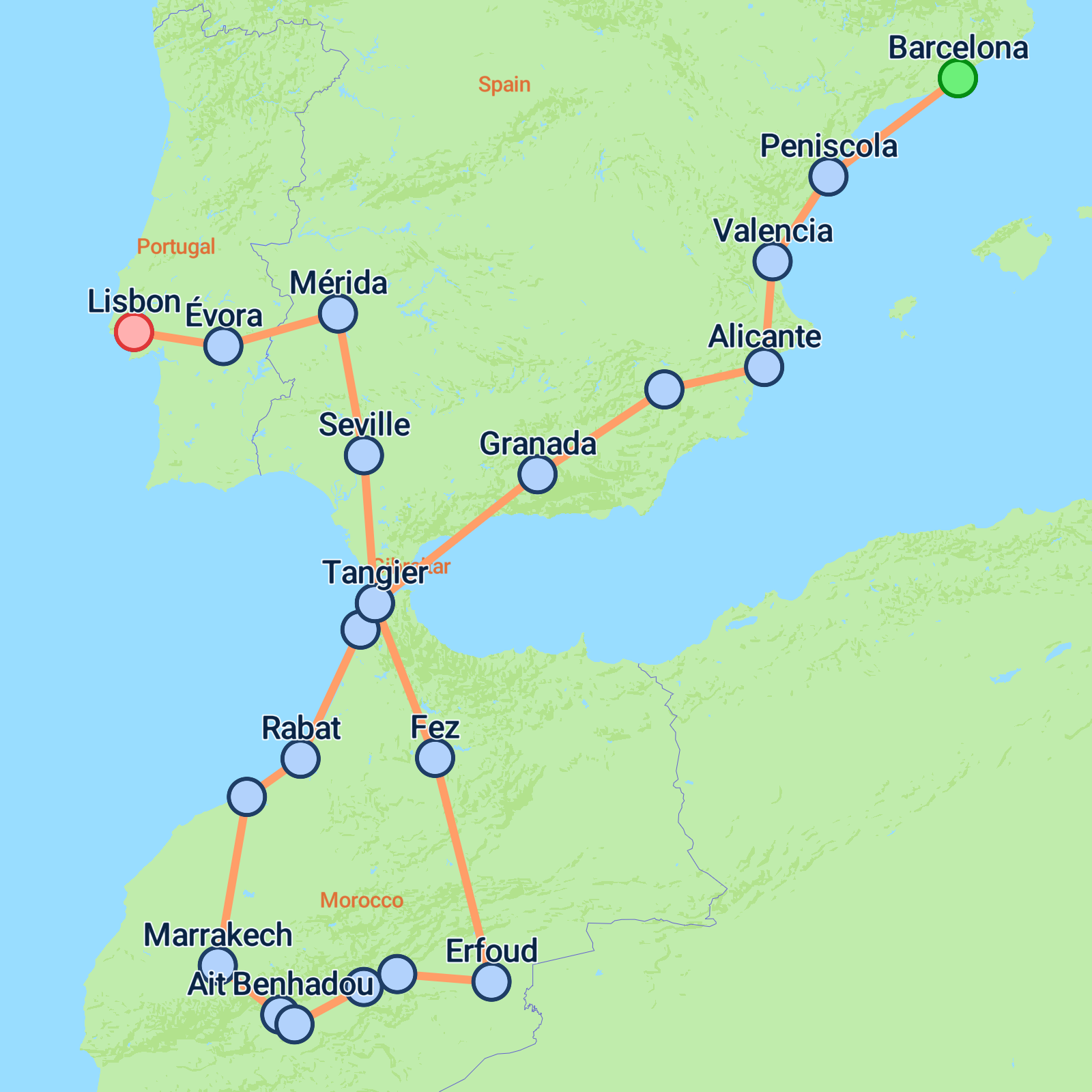 Kick off an unforgettable 17-day adventure in the vibrant city of Barcelona and wrap up in the charming streets of Lisbon. Roam through Spain's iconic landmarks, from the modernist marvels of Barcelona to Valencias historic wonders and Granada's majestic Alhambra. Witness the enchantment of Morocco as you traverse from the bustling medinas of Marrakech to the serene sands of the Sahara Desert, complete with a sunset adventure. Relish the cultural splendour of Seville, explore Mrida's Roman roots, and savour the rich flavours of Portuguese cuisine in Lisbon. This tour promises a dazzling blend of history, culture, and breathtaking landscapes.