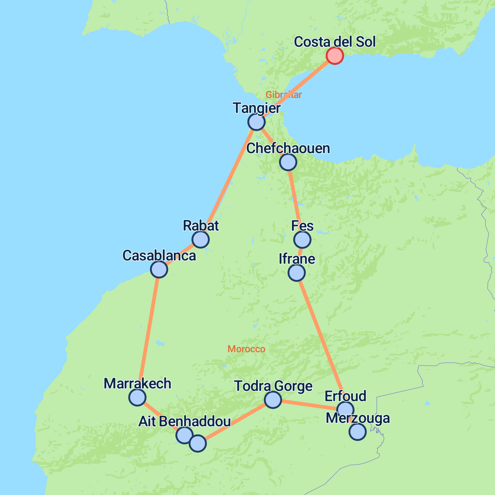 Explore the magic of Morocco on this nine-day adventure from Spain’s Costa del Sol to Tangier, Casablanca, Marrakesh and beyond. Travel through imperial cities, mountain passes and desert dunes, with highlights including Marrakesh’s lively Jemaa el-Fna Square, the UNESCO-listed Kasbah of Ait Ben Haddou, and a camel ride across the sands of Merzouga. Wander the medinas of Fes and Chefchaouen, the Blue Pearl, and marvel at the grandeur of Casablanca’s Hassan II Mosque. From bustling souks to starlit desert skies, this journey captures the colour, culture and contrasts of Morocco before returning to the Costa del Sol.