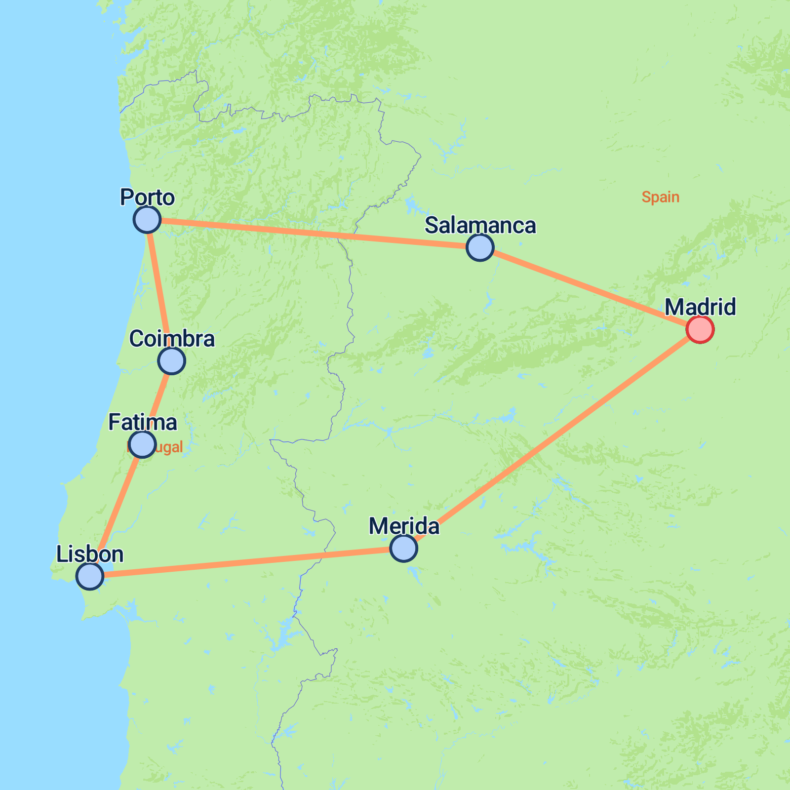 Madrid - Salamanca (Spain) - Porto (Portugal). Madrid - Salamanca (Spain) - Porto (Portugal). We depart from the bus terminal at 8:00 a.m. and travel to Salamanca, a historic university city renowned for its impressive architecture. You will have free time to explore the old town and admire the elegant Baroque-style Plaza Mayor. We then continue our journey to Porto, where we stay overnight