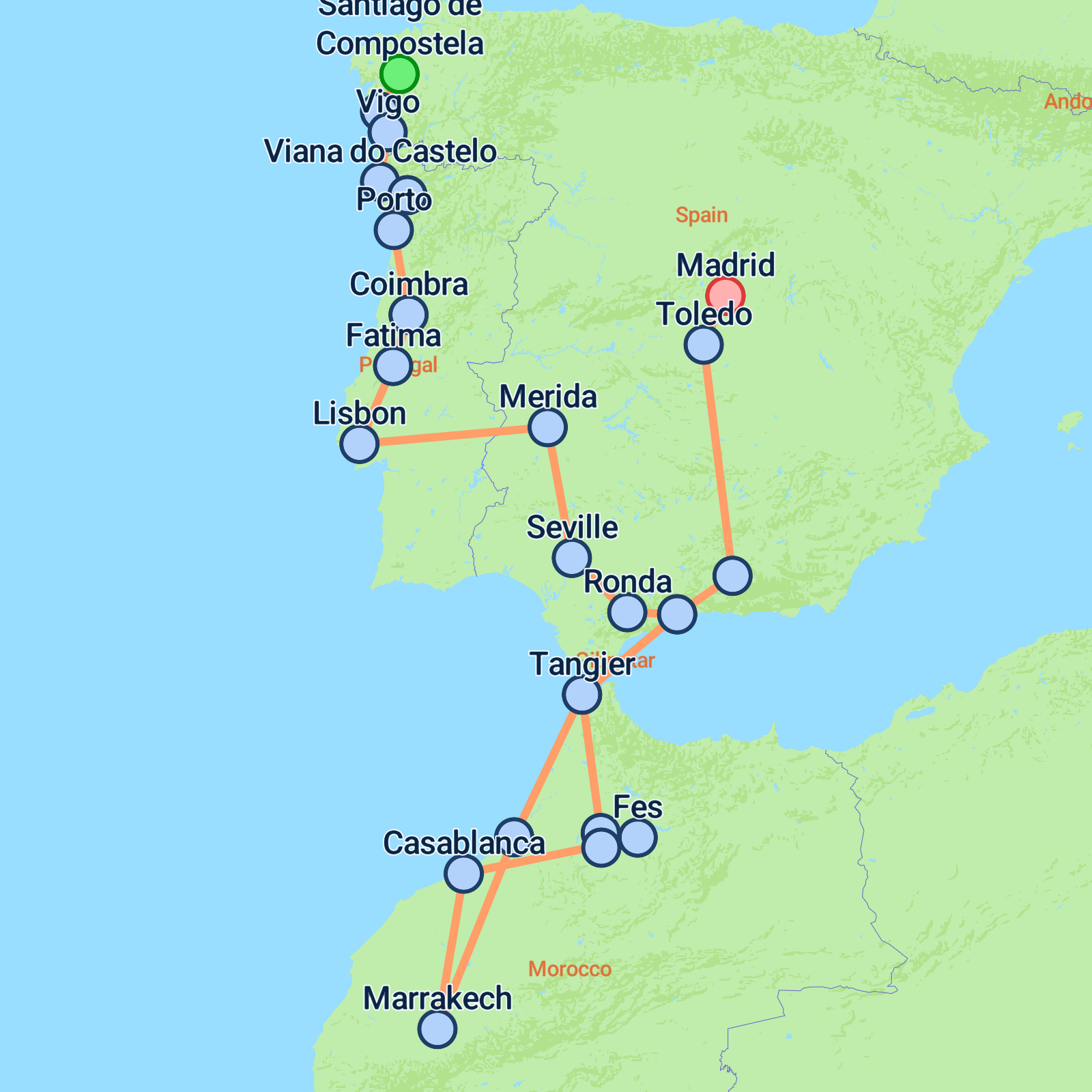 Journey across Spain, Portugal, and Morocco on a 19-day adventure from Santiago de Compostela to Madrid. Travel through Galicia’s coastal scenery and the Portuguese gems of Porto, Coimbra, and Lisbon before heading south to Andalusia. Cross the Strait of Gibraltar to Tangier and uncover Morocco’s imperial cities, including Fes, Marrakech, and Rabat, before returning to Spain. Highlights include the Roman ruins of Mérida, the stunning Alhambra in Granada, and the charm of Toledo’s old town.