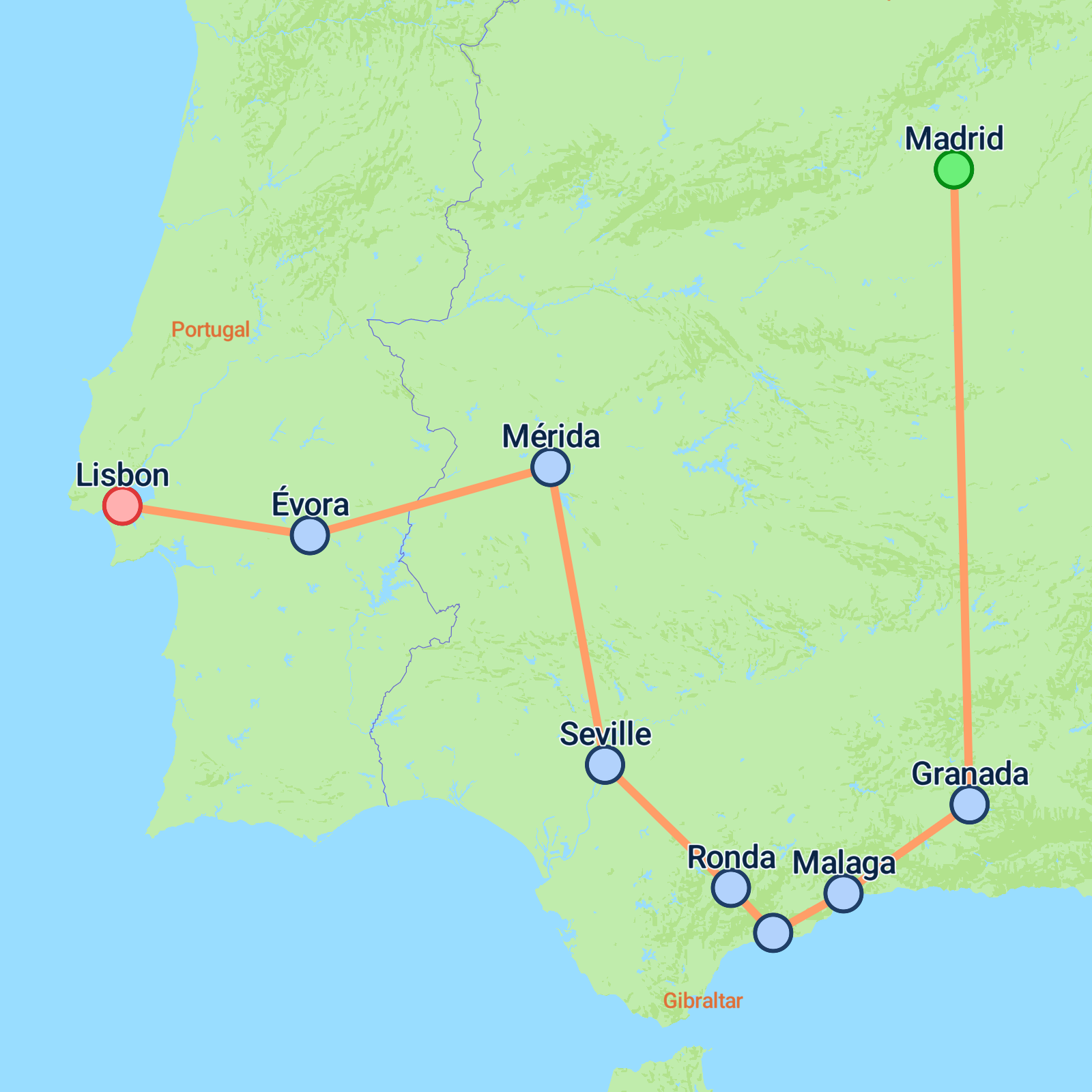 Start your eight-day adventure in the vibrant city of Madrid, where youll delve into the bustling nightlife and iconic sights such as Puerta de Alcal and Retiro Park. From there, journey south to Granada, taking in the quaint charm of La Mancha and the historic allure of the Alhambra. Head to the sun-kissed Costa del Sol, exploring Mlagas art scene and the glitzy marina of Puerto Bans in Marbella. In Ronda, admire the dramatic gorge before arriving in Seville for flamenco and a leisurely cruise on the Guadalquivir. End your tour in Lisbon, steeped in rich history and offering picturesque views from its seven hills.