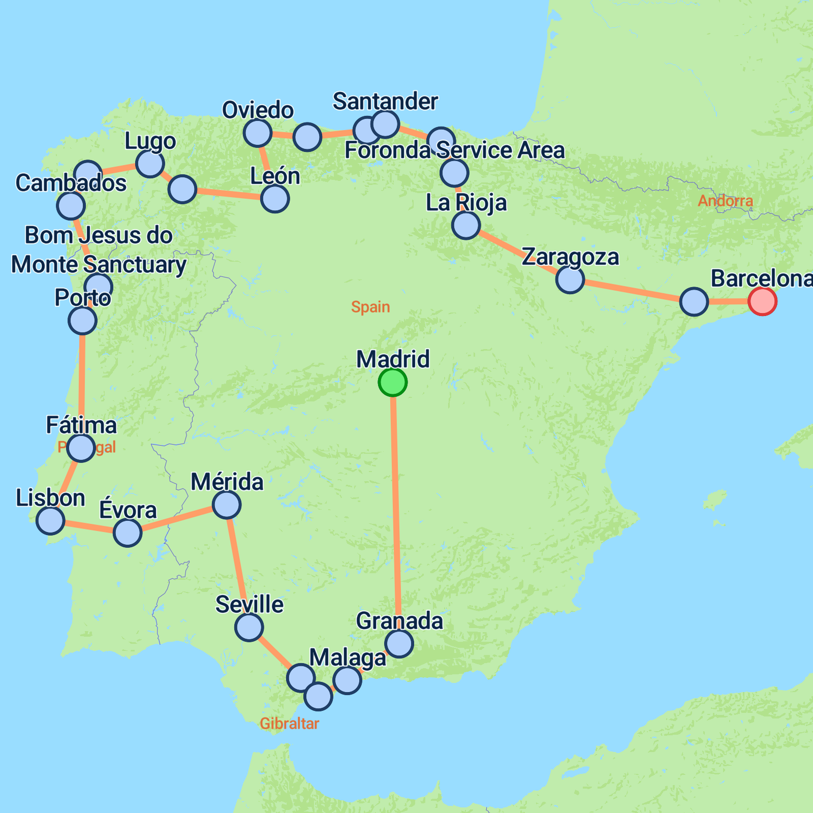 Embark on a vibrant 15-day journey starting in Madrid, exploring Spain and Portugal, and ending in the bustling city of Barcelona. Discover Madrids lively plazas and historic architecture, then head south through La Mancha to the enchanting Alhambra in Granada. Enjoy a taste of Andalusian charm in Seville, followed by Portugal's coastal landscapes and Lisbons charming alleys. Delight in Porto's picturesque Douro River and Galicias captivating Santiago de Compostela. Journey through the scenic Asturian hills, visiting historic towns and indulging in local delicacies. Finish with a cultural immersion in Barcelona, marvelling at Gaudis masterpieces and soaking in the Mediterranean atmosphere.