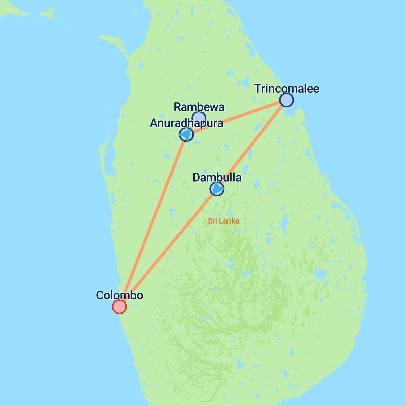 Start location: Colombo End location: Colombo Total number of days: 4 Key experiences or destinations: Wilpattu National Park safari, Sacred City of Anuradhapura, Mihintale rock, Kantale Dam, Trincomalee (Dutch Fort, Koneswaram Temple), Pigeon Island boat ride, Dambulla cave temple, Sigiriya rock fortress Set off from Colombo on this fourday adventure, looping through Sri Lankas cultural heartlands and wild landscapes before returning to the city. Youll explore ancient Anuradhapura, spot wildlife on a Wilpattu National Park safari, and soak up coastal vibes in Trincomalee. Expect to see iconic sites like the Dambulla cave temple and climb the legendary Sigiriya rock fortress. With a mix of history, nature, and a dash of seaside charm, this tour is perfect for travellers keen to experience Sri Lankas highlights at a relaxed pace.