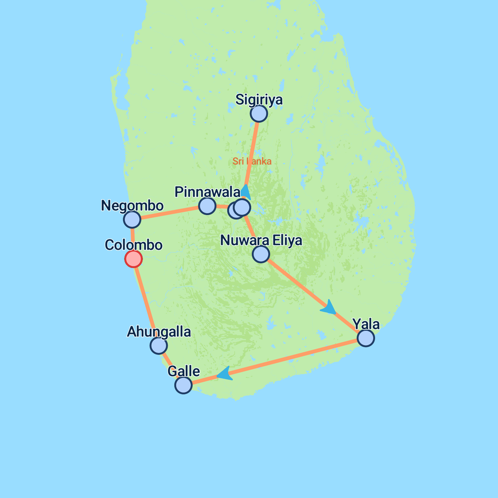 This 9-day tour starts in Colombo and finishes there after a scenic journey through Sri Lankas highlights. Youll begin with a relaxing stay in Negombo before heading inland to Kandy, where youll explore the Temple of the Tooth and the lush Peradeniya Botanical Gardens. Expect a climb up the impressive Sigiriya Rock Fortress and a memorable visit to the Pinnawala Elephant Orphanage. The adventure continues with wildlife spotting on safari in Yala National Park and a cultural city tour of Galles Dutch Fort. The trip wraps up with some coastal relaxation in Ahungalla before your return to Colombo.