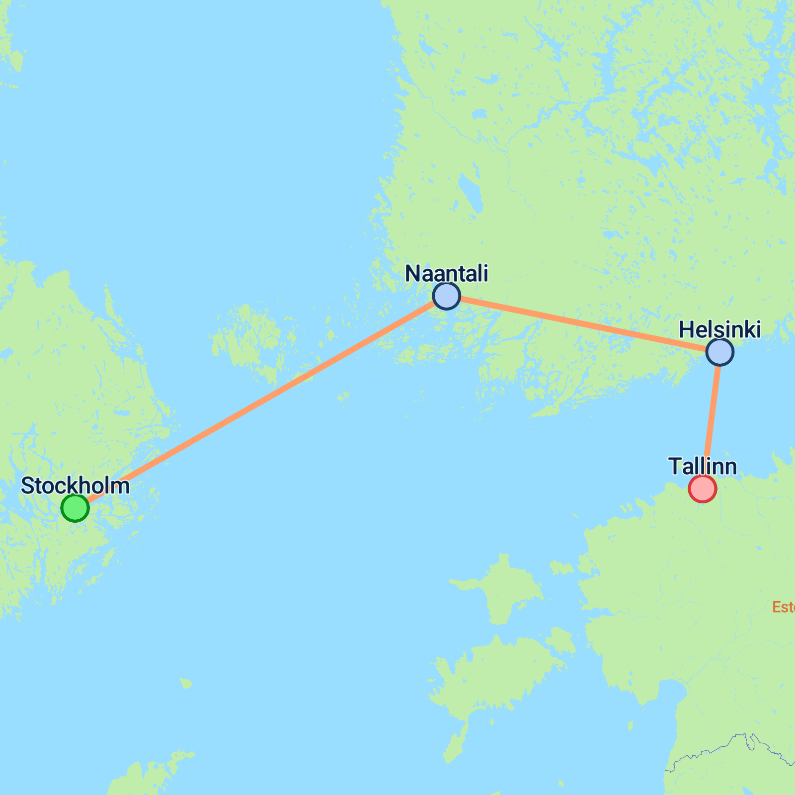Begin your Scandinavian adventure in the charming city of Stockholm and wrap up in the historic streets of Tallinn over an exciting 7-day tour. Start exploring Stockholm, with its vibrant Gamla Stan and the stunning views from Fjllgatan. Enjoy a leisurely day before cruising overnight to Finland, where the picturesque landscapes of the land Islands greet you at sunrise. Discover Turku and the quaint town of Naantali before heading to Helsinki for a dose of culture and markets. A quick ferry ride will take you to Estonia, where Tallinn's medieval charm awaits. Expect a blend of history, stunning scenery, and cultural vibrancy.