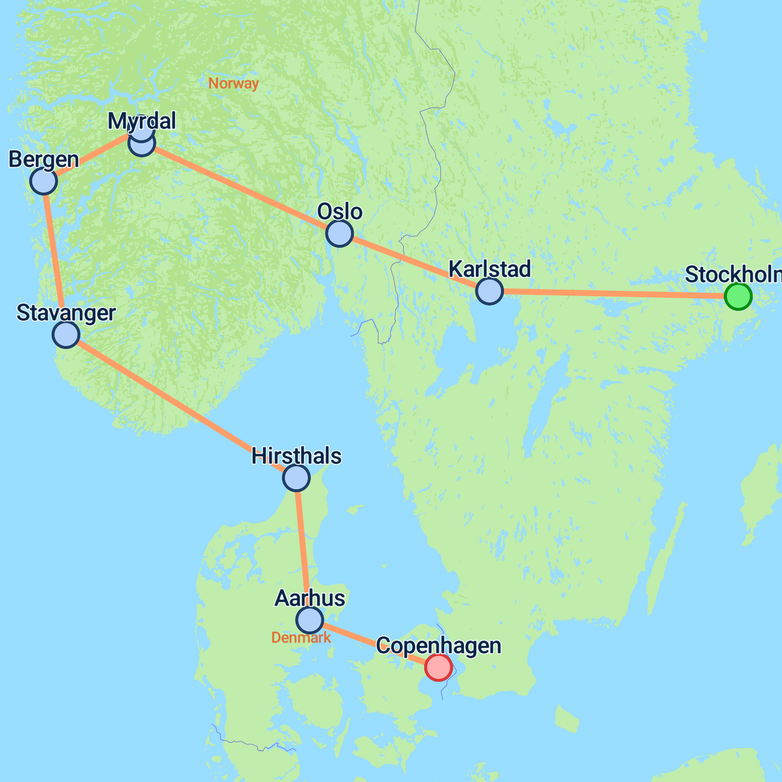 PRIVATE TOUR: Discover the best of Scandinavia on this 10-day journey from Stockholm to Copenhagen, travelling through Sweden, Norway and Denmark. Explore Stockholmâs charming Old Town before heading west to Oslo and the dramatic Norwegian fjords. Ride the scenic FlĂ„msbana railway, cruise the UNESCO-listed NĂŠrĂžyfjord, and take in Bergenâs mountain views before sailing to Stavanger. Continue by overnight ferry to Denmark, visiting cultural Aarhus and finishing in Copenhagen with a classic canal tour and time to enjoy Tivoli Gardens. A perfect blend of cities, scenery and Nordic charm from start to finish.