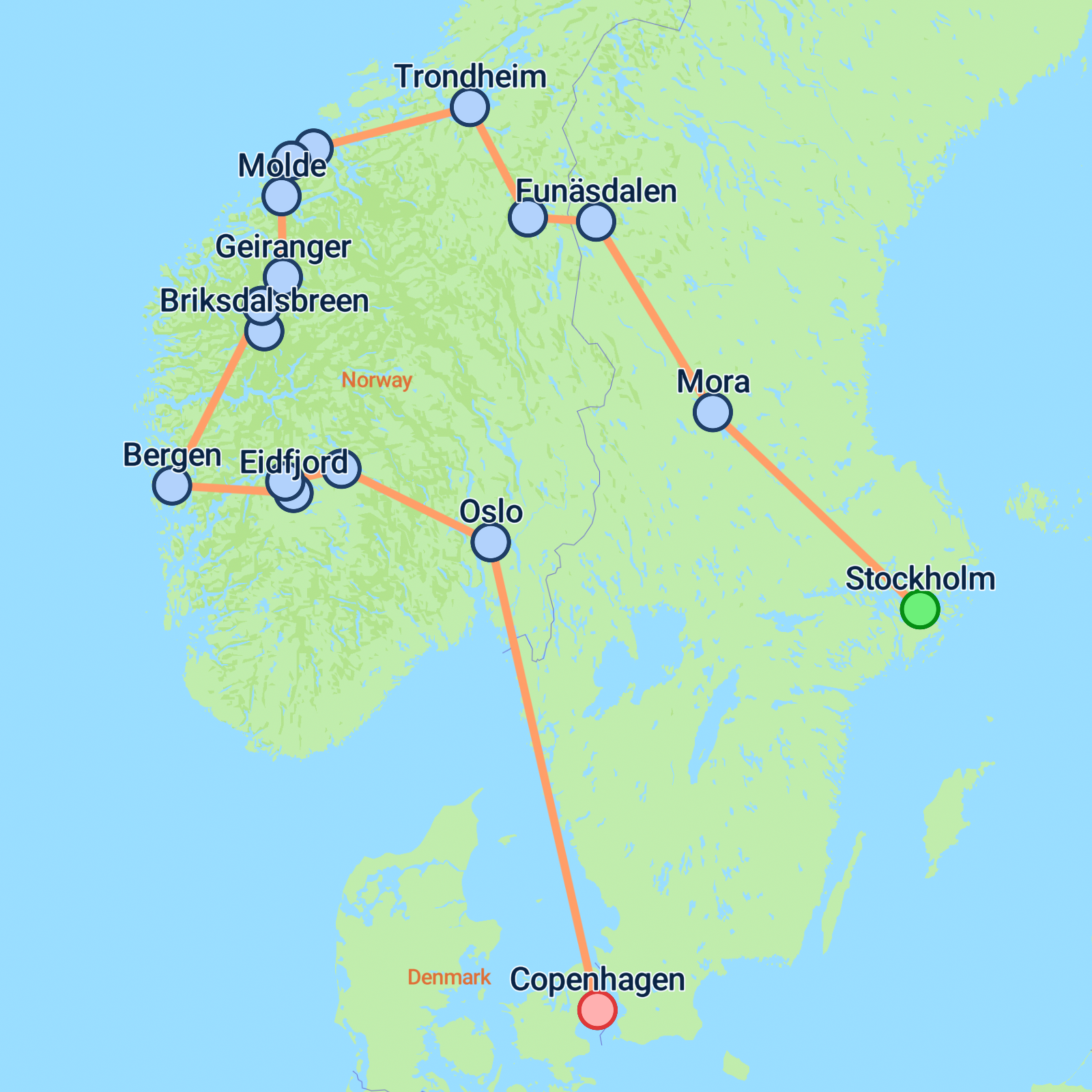 Discover the breathtaking landscapes and rich history on this 10-day adventure starting in vibrant Stockholm and ending in charming Copenhagen. Explore Stockholm's historic Gamla Stan and incredible views from Fjllgatan. Travel through Swedens picturesque countryside to Norway, where youll visit the historic town of Rros and vibrant Trondheim, with its medieval cathedral. Take in the stunning natural beauty of Kristiansund and the iconic Atlantic Road. Marvel at Geiranger Fjord and hike to Briksdalsbreen Glacier before arriving in Bergen. Cross the Hardanger Fjord to Oslo, and overnight aboard a modern ferry to lively Copenhagen, ending with a tour through its colourful streets. Unforgettable moments await!