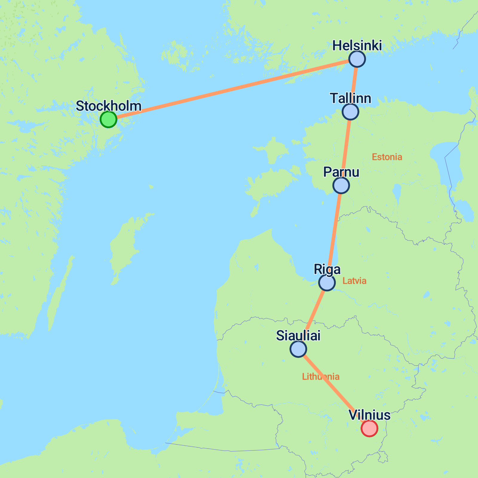 Discover the charm of the Baltic region on this nine-day journey from Stockholm to Vilnius, taking in three captivating capitals along the way. Begin with a guided tour of Stockholm before cruising across the Baltic Sea to Helsinki, where striking architecture and seaside markets await. Continue to Tallinn, with its fairytale Old Town, then travel via the seaside resort of Pärnu to elegant Riga, famed for its Art Nouveau buildings and lively old quarter. Conclude in Vilnius, exploring its cobbled streets, baroque churches and the mysterious Hill of Crosses. A perfect blend of culture, history and scenic charm.