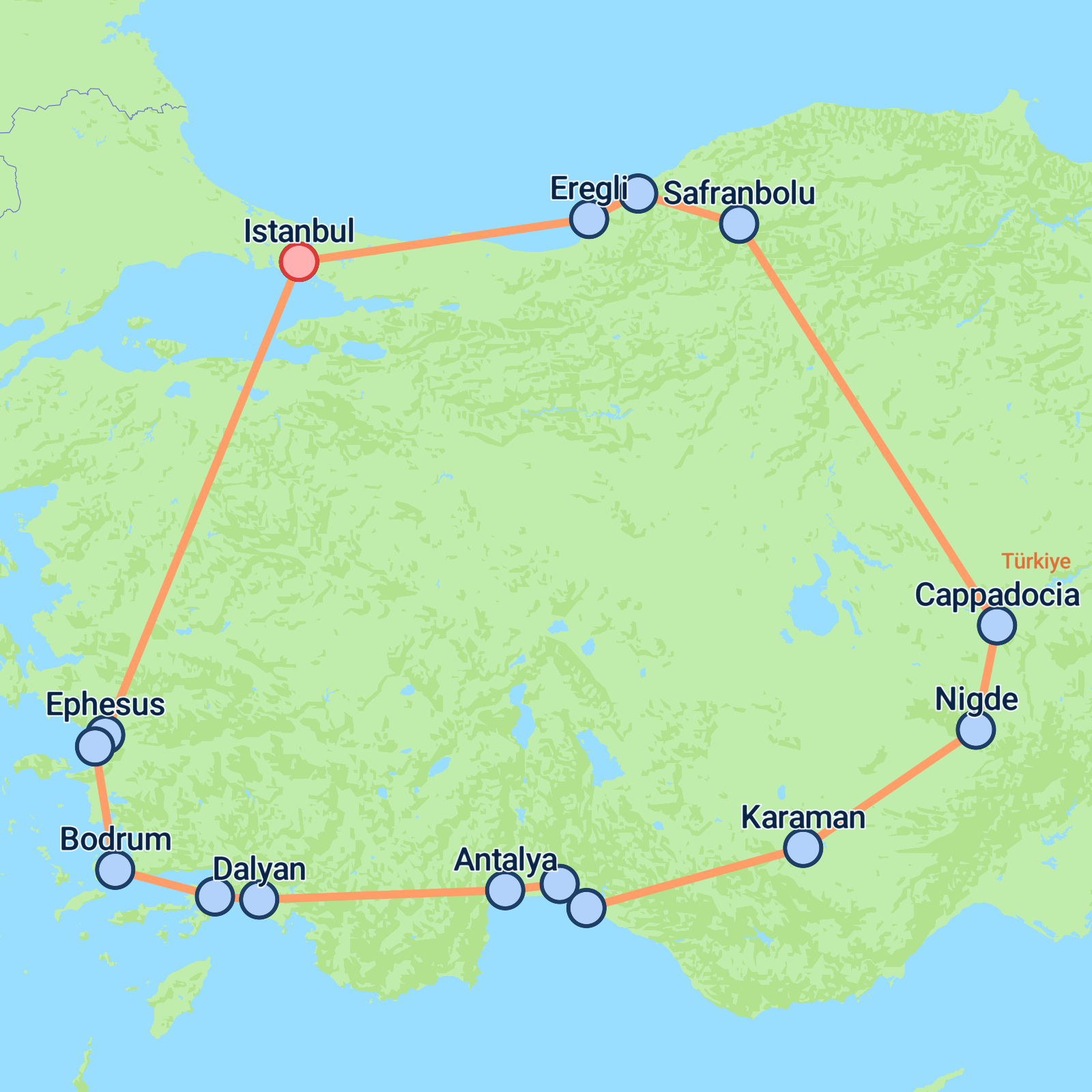 Embark on an 11-day adventure starting and ending in the vibrant city of Istanbul. Discover the majestic Suleymaniye Mosque and cruise along the Bosphorus, revealing the beauty of the city's European and Asian sides. Journey to the ancient wonders of Ephesus and indulge in the lively coastal charm of Kusadasi. Wander through the stunning landscapes of Bodrum, Marmaris, and Antalya, marvelling at Hadrians Gate and cascading waterfalls. Explore the unique rock formations of Cappadocia, the historic streets of Safranbolu, and the mystical caves at Gkl Magras?. This tour blends dazzling history with captivating natural beauty, offering a perfect Turkish escape.