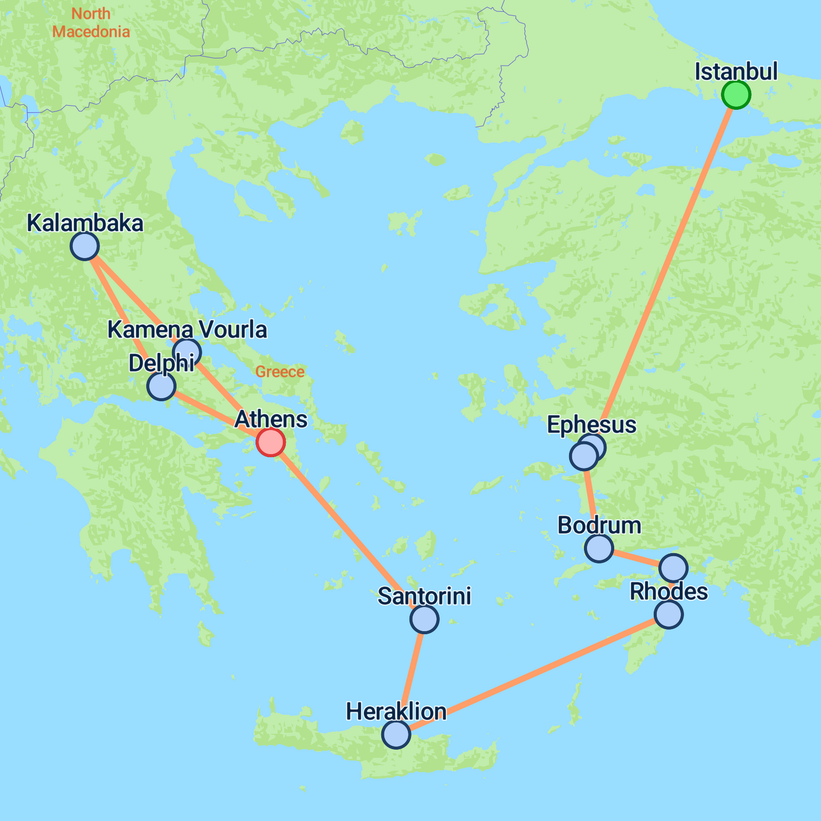 Embark on a thrilling 15-day adventure starting in Istanbul and concluding in Athens, exploring the diverse beauty of Turkey and Greece. In Istanbul, you'll delve into the city's rich history with visits to iconic landmarks like the Suleymaniye Mosque and Topkapi Palace. Cruise the Bosphorus before heading to Ephesus, a remarkably preserved ancient city. Coastal delights await in Kusadasi, Bodrum, and Marmaris before you sail to the Greek Island of Rhodes. Discover Crete's charms, from the Palace of Knossos to Agia Galini's beaches. Experience Santorini's stunning vistas, and journey through Greece, visiting Meteora's monasteries and the archaeological splendour of Delphi. This journey finishes with a captivating tour of Athens, blending ancient landmarks with vibrant modern culture. Perfect for those seeking rich history, breathtaking landscapes, and cultural immersion.