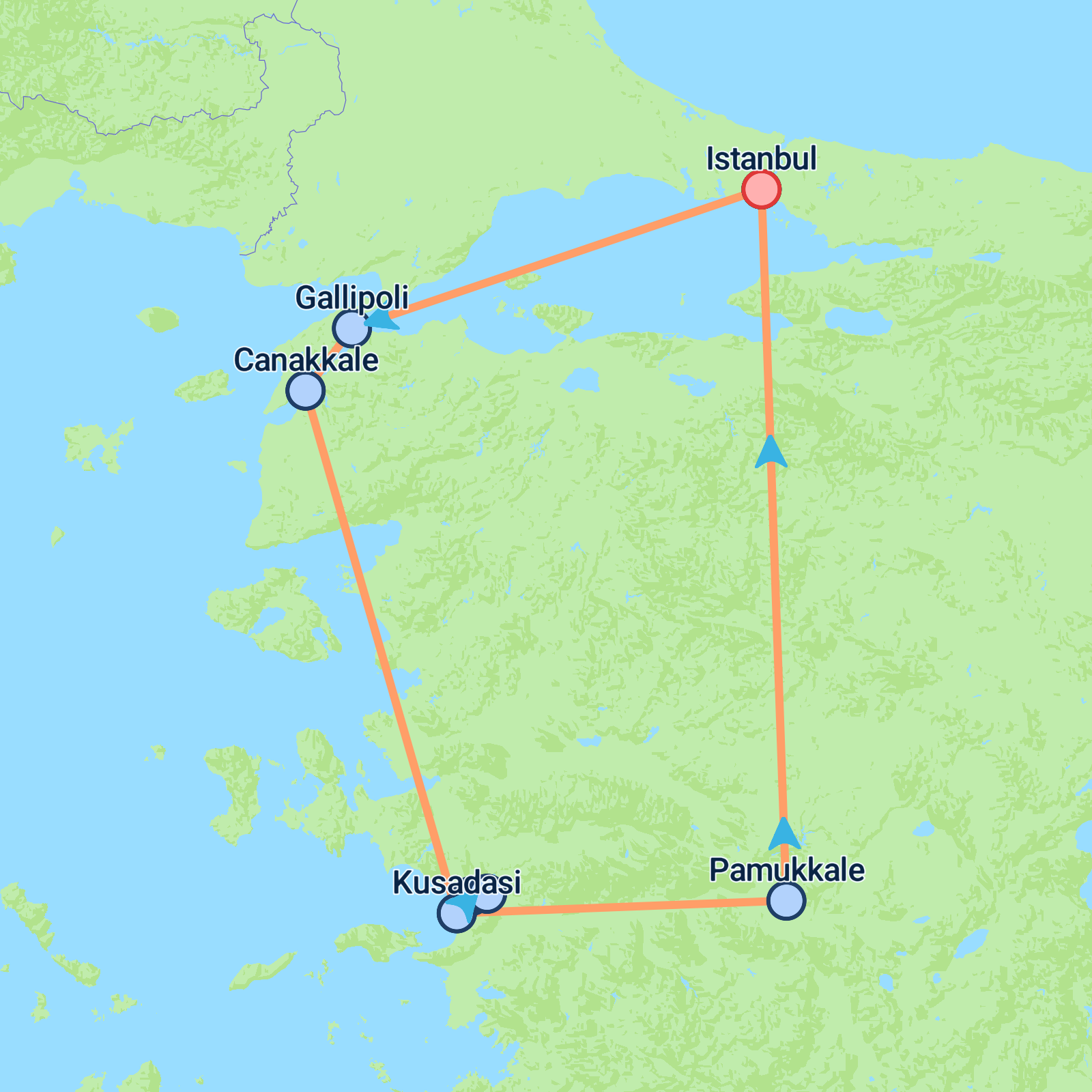 This 7-day tour starts and ends in Istanbul, offering a fantastic blend of history, culture and stunning landscapes. Youll explore Istanbuls iconic landmarks like the Blue Mosque and Hagia Sophia, then head to Gallipolis poignant battlefields. Discover the ancient wonders of Troy and Pergamon before arriving in Kusadasi to visit the remarkable ruins of Ephesus and the charming village of Sirince, famous for its fruit wines. The journey continues to Pamukkales surreal white terraces and ancient Hierapolis. With a great mix of archaeological sites, local crafts and scenic beauty, this tour promises a rich and varied experience at a relaxed pace.