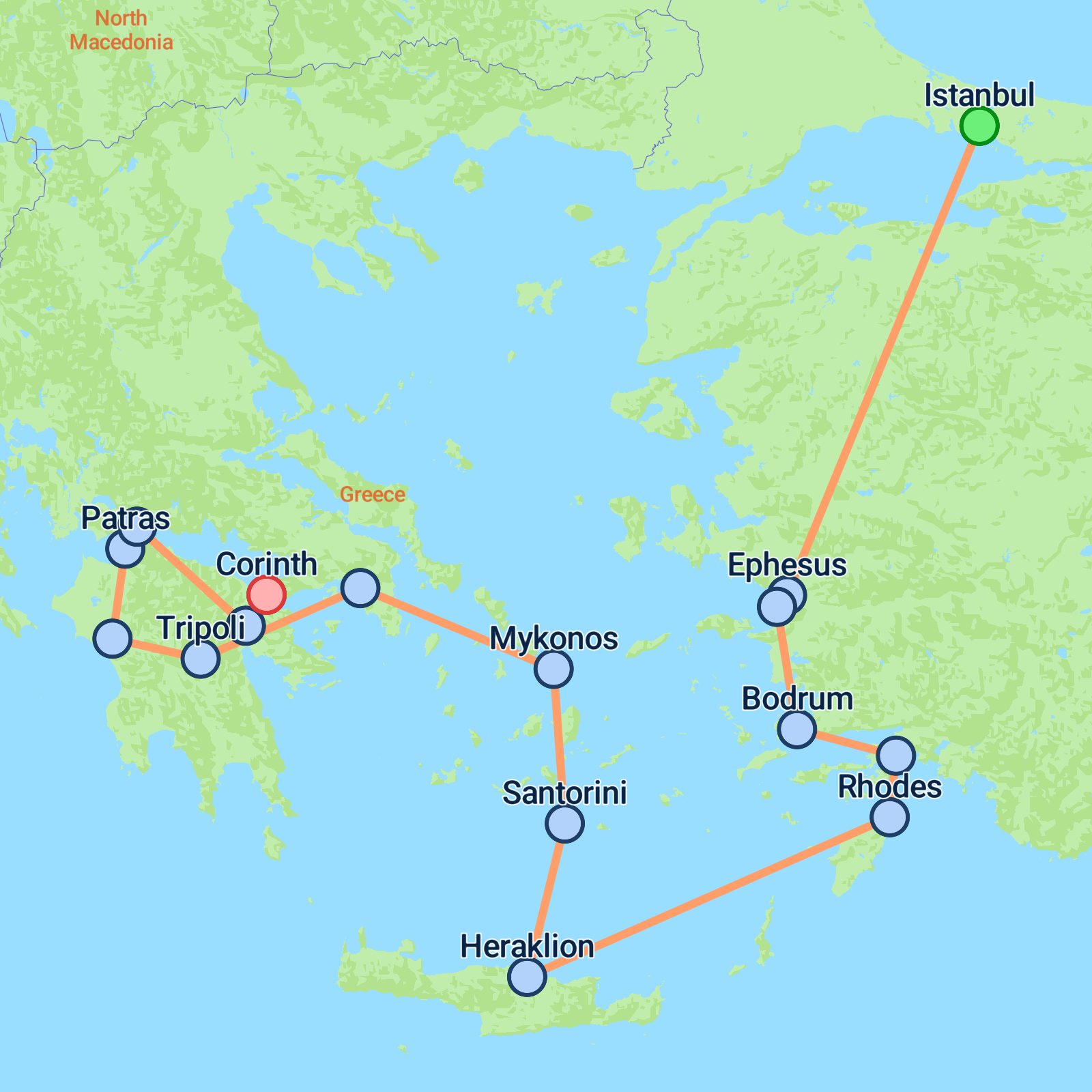 Embark on an 18-day adventure starting in the bustling city of Istanbul and concluding in the historical marvel of Athens. Your journey will introduce you to vibrant Istanbul's sights like the Hagia Sophia and a serene Bosphorus boat trip. Wander through the ancient ruins of Ephesus and relax in the charming coastal town of Kusadasi. Experience Greece's treasures, from exploring Rhodes' walled city to the breathtaking landscapes of Crete, including Heraklion and the Palace of Knossos. On to the iconic islands, youll soak in the unique allure of Santorini and the mythological charm of Mykonos. The journey wraps up with visits to legendary Athens, Olympia, and Mycenae. Expect a mixture of history, culture, and stunning scenery throughout the tour.