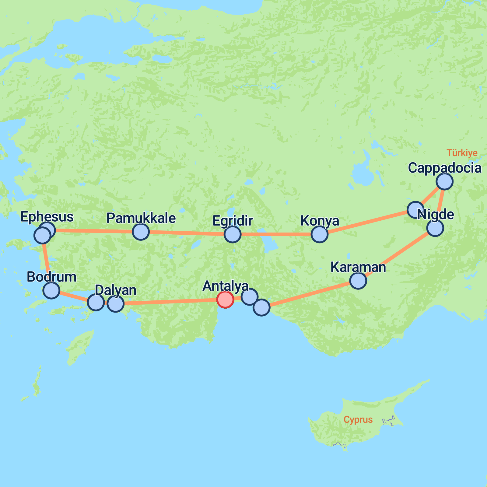 Embark on a 9-day adventure across Turkey starting and ending in the vibrant city of Antalya. From exploring the well-preserved Roman theatre in Aspendos to the captivating lunar-like landscapes of Cappadocia this tour promises a blend of history, culture, and mesmerising scenery. Traverse the Taurus Mountains and step back in time at the ancient ruins of Ephesus. Enjoy the tranquil beauty of Lake Bafa and the coastal charm of Bodrum. In Dalyan, take a riverboat trip to see the iconic Lycian Rock Tombs. Expect to be enchanted by Turkey's diverse landscapes and rich heritage on this unforgettable journey.