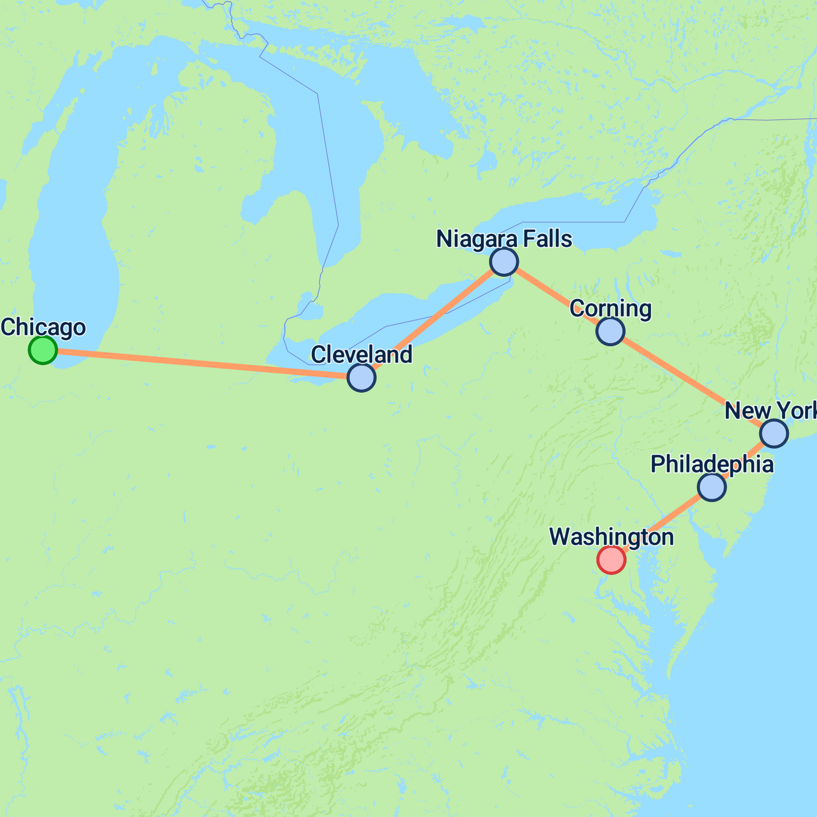 Embark on a thrilling 10-day adventure starting in Chicago and concluding in Washington D.C. Begin by exploring Chicago's vibrant Millennium Park and iconic The Loop. As you journey, discover Cleveland's cultural scene, including the Rock and Roll Hall of Fame. Brace yourself for the awe-inspiring Niagara Falls, where you'll glide on the Maid of the Mist for an up-close experience. Discover New York City's myriad of attractions, from Central Park to Times Square's dazzling lights. Continue to Philadelphia's historic Independence Park, and finally, immerse yourself in the landmarks of Washington D.C. This tour blends urban excitement with natural wonders.