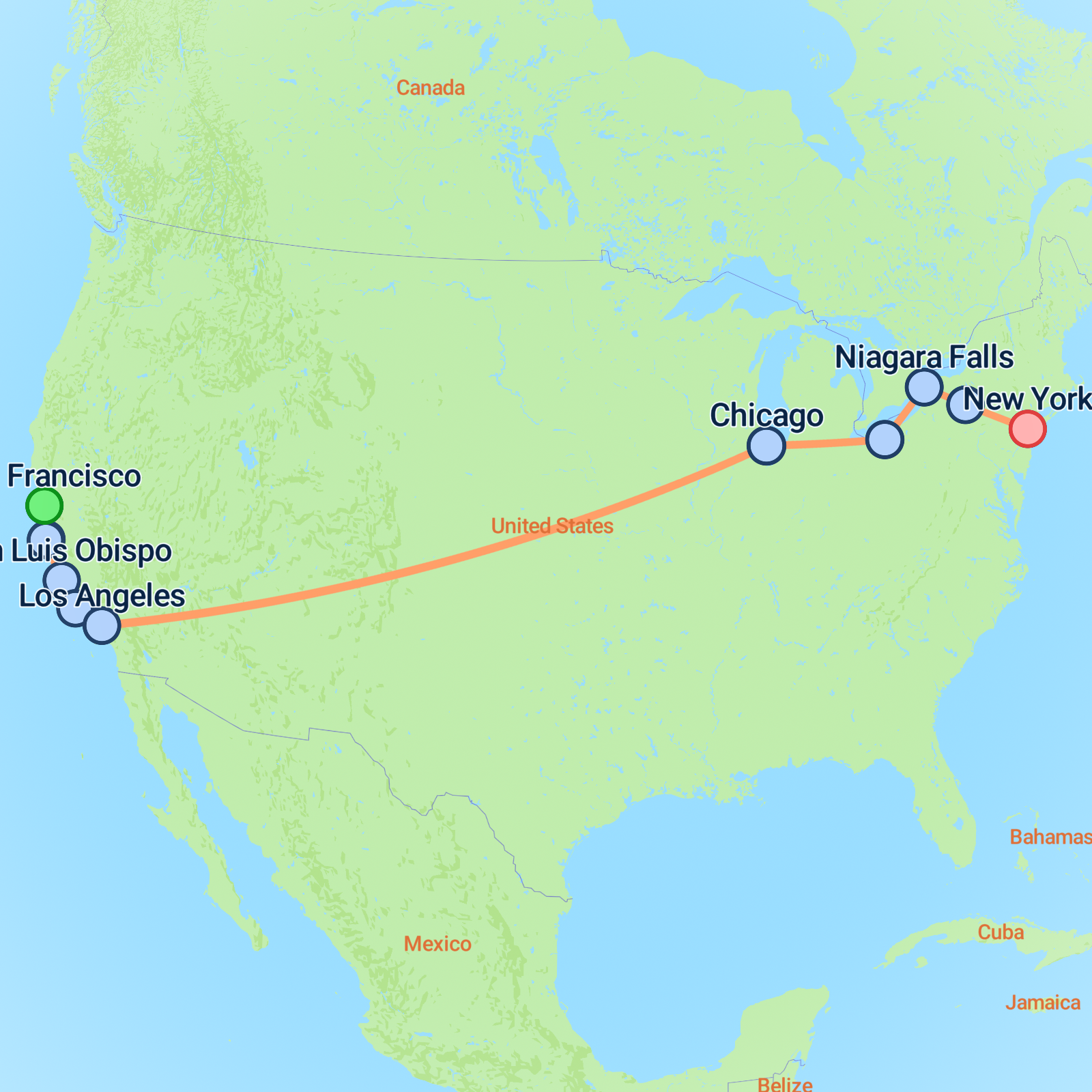 Set off on an extraordinary 14-day adventure from the vibrant streets of San Francisco to the iconic skyline of New York. Begin your journey exploring San Francisco's eclectic neighbourhoods and famous landmarks like the Golden Gate Bridge. Meander down the picturesque coast visiting charming Monterey and Carmel before heading to Santa Barbara's sunny beaches. Dive into the glitz of Los Angeles Hollywood, Beverly Hills and beyond await. Fly to the Windy City, Chicago, for a city tour, then venture to Cleveland and onto the breathtaking Niagara Falls. Conclude in New York, soaking up its dazzling energy with visits to Times Square and Central Park. Each day promises unforgettable sights and sounds.