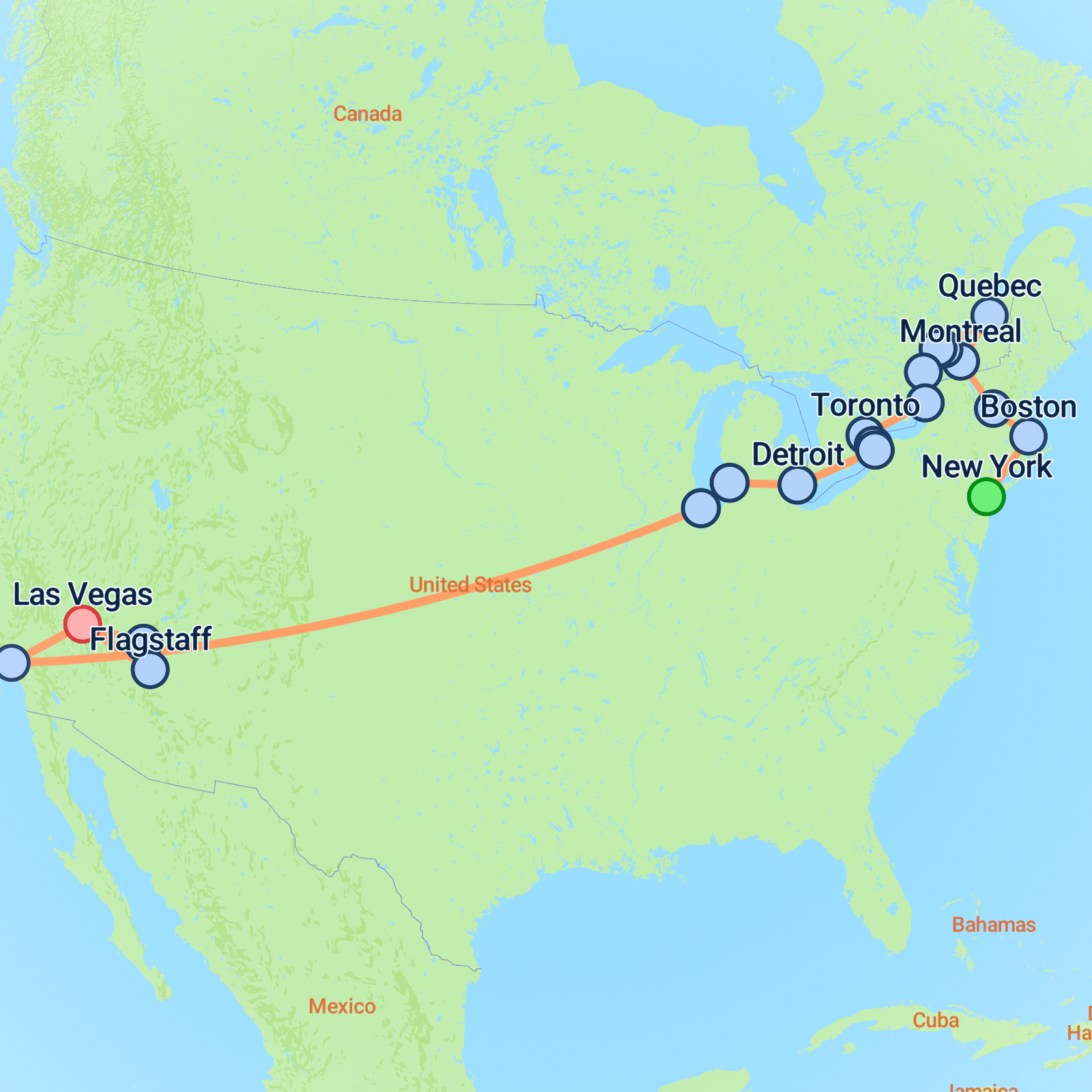 Start your adventure in the bustling streets of New York and conclude in the vibrant city of Las Vegas on this exhilarating 19-day tour. Discover the iconic landmarks of New York, and then delve into the historical streets of Boston. Marvel at the picturesque scenery as you cross into Canada to explore Montreal and Quebec's charming old-world allure. Glide through the stunning Thousand Islands, and get captivated by the thundering Niagara Falls. Experience the lively atmosphere of Toronto and the cultural richness of Chicago. Finally, soak up the glamour of Los Angeles before the bright lights of Las Vegas. This tour is a perfect blend of urban excitement and natural wonders. Expect unforgettable memories at every turn.