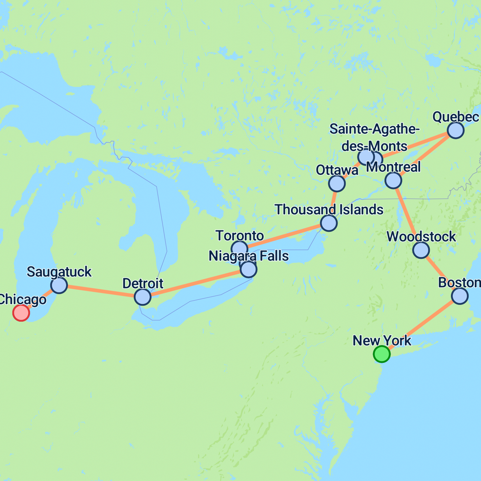 Kick off your adventure in the bustling streets of New York for an exciting 14-day tour ending in the vibrant city of Chicago. Dive into the iconic sights of New York, from Central Park to Times Square, before heading to historic Boston and experiencing quaint Woodstock. Cross into Canada to explore lively Montreal and charming Quebec, with highlights like Parc Mont Royal and Chateaux Frontenac. Venture through Canada's stunning landscapes, visit Ottawa's Parliament Buildings, and cruise the majestic Thousand Islands. Glide past legendary Niagara Falls before re-entering the US to uncover Detroit's rich history. Wrap up in the Windy City, savouring Chicago's spectacular architecture and vibrant urban life. Expect an unforgettable mix of cityscapes, cultural landmarks, and scenic wonders.