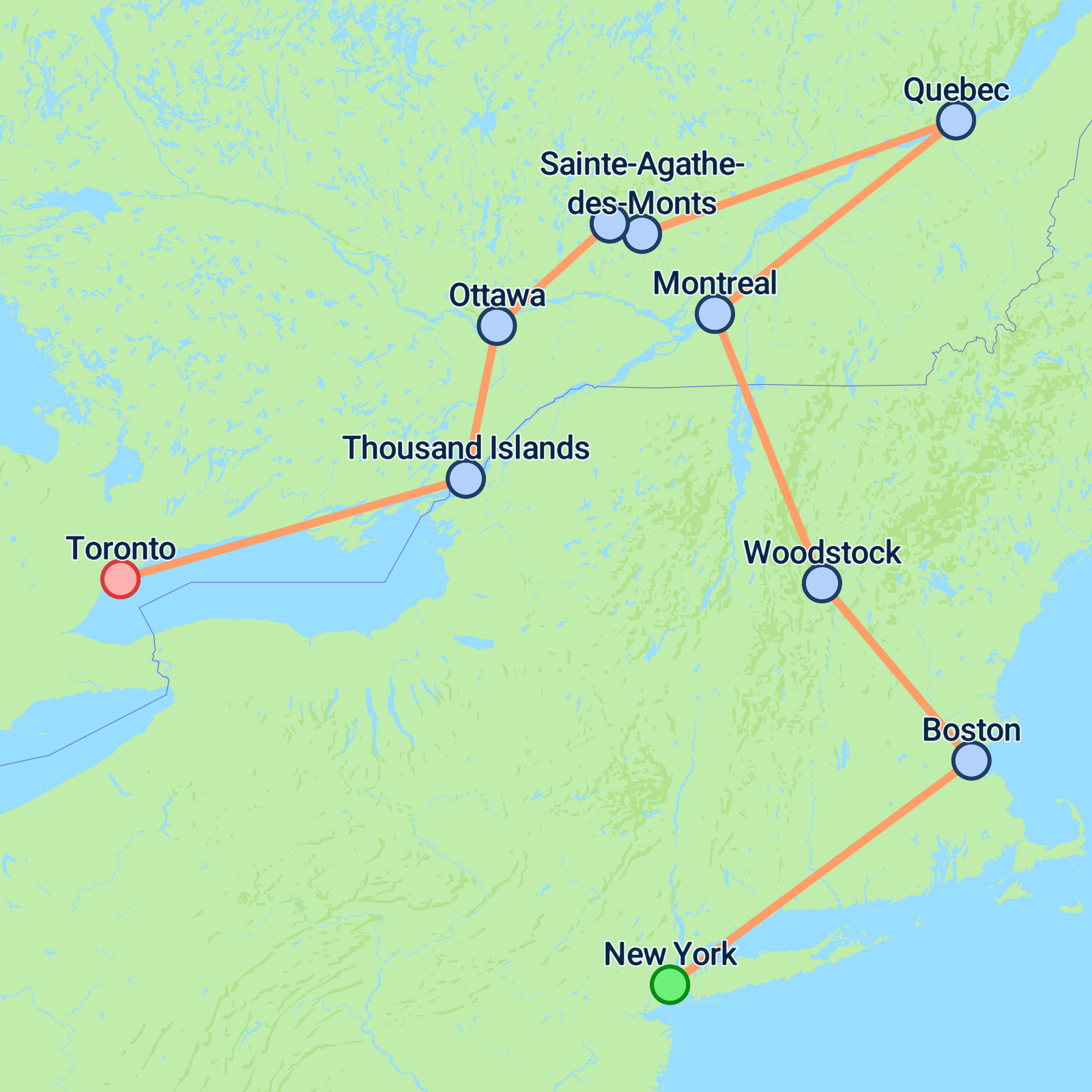 Embark on an unforgettable 11-day journey starting in the bustling city of New York and culminating in the vibrant metropolis of Toronto. Begin with exploring iconic Manhattan sights, including the Statue of Liberty and Times Square's bright lights. Journey to Boston for a taste of history at Harvard and Quincy Market before venturing through the picturesque landscapes of Vermont to reach Canada's cosmopolitan cities. Discover Montreal's majestic Oratory, Quebec's historic charm, and Ottawa's stately Parliament. Cruise through the stunning 1000 Islands en route to Toronto, where cultural delights and the mighty Niagara Falls await your exploration. This adventure promises a rich blend of history, nature, and vibrant urban experiences.