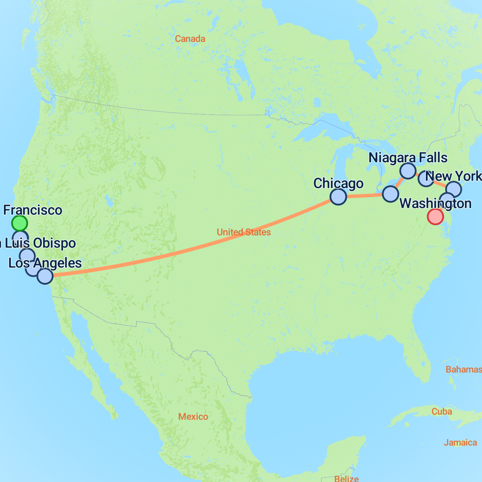 Embark on an unforgettable 16-day journey starting in the vibrant city of San Francisco and concluding in the historic capital, Washington D.C. This tour offers an exciting mix of cultural experiences and iconic sights. In San Francisco, youll explore landmarks like the Golden Gate Bridge and charming neighbourhoods like Chinatown. Onward to the coastal beauty of Monterey and elegant Carmel before reaching the sea-front allure of Santa Barbara on your way to Los Angeles. Discover Hollywood glamour and stunning beaches before flying to Chicago to enjoy its architectural wonders. Journey east via Niagara Falls to the bustling metropolis of New York, for a taste of Broadway magic, before delving into the heart of American history in Washington D.C. Expect to see legendary sites, diverse landscapes, and vibrant city life.