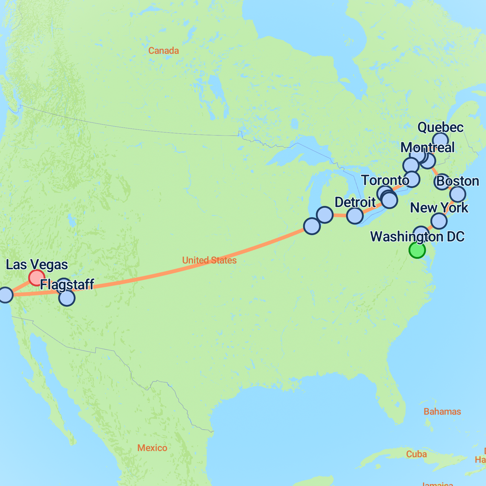 Begin your adventure in Washington D.C., exploring its iconic landmarks over two days. Snap photos at the White House, take a boat trip on the Potomac River, and enjoy the nightlife in Georgetown. Journey through Lancasters Amish country before reaching the buzz of New York City for two days of vibrant culture, Broadway lights, and Central Park. Continue to Boston's historic streets, soak in the charm of Woodstock, and delve into Montreal's delights. Discover Quebec Citys stunning architecture, sail through the Thousand Islands, and encounter Torontos bustling sights. Embrace the power of Niagara Falls before travelling west to Detroit and Chicago. With a domestic flight to Los Angeles, explore Hollywood's glitz. End this 21-day adventure with the neon intensity of Las Vegas and a day trip to the Grand Canyon.