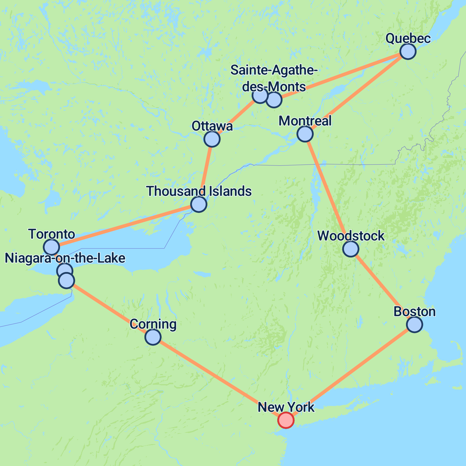 Embark on a 12-day adventure starting and ending in the iconic New York City. Immerse yourself in the vibrant buzz of Manhattan before heading to Boston to explore its rich history. Cross into Canada, soaking in the beauty of Montreal and the old-world charm of Quebec. Traverse the picturesque landscapes of the Laurentian Hills and ski stations of Mount Tremblant, before reaching the Canadian capital, Ottawa. Experience the Thousand Islands cruise, then delve into Torontos urban allure. Round off your journey at the majestic Niagara Falls, where a thrilling cruise awaits. This tour promises a whirlwind of culture, scenery, and unforgettable experiences.