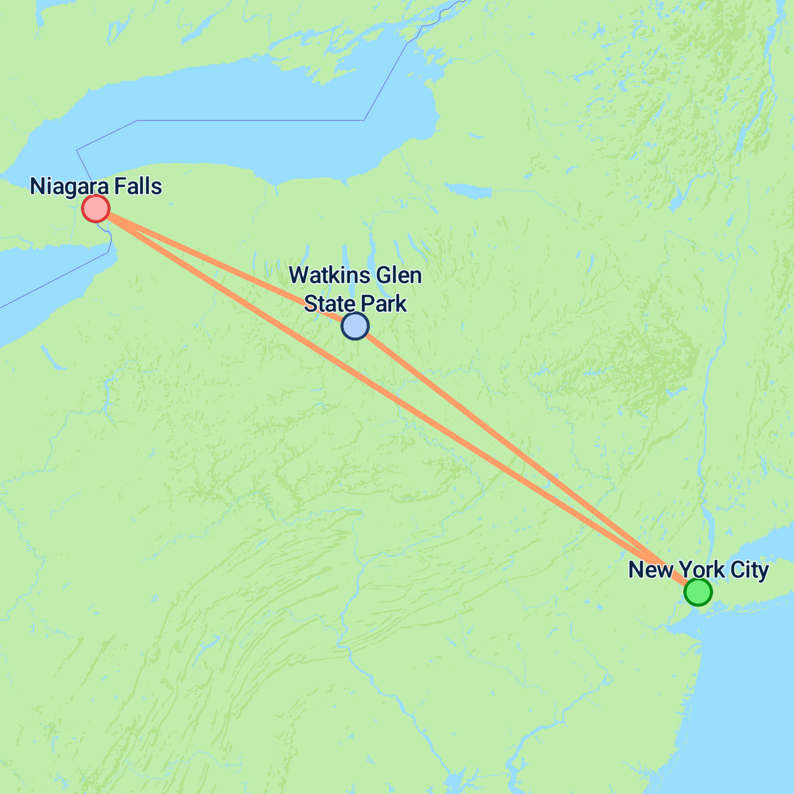 Niagra Falls - Watkins Glen State Park - New York. This morning, take one final look at Niagara Falls before starting your return journey to New York City. En route, stop at Watkins Glen State Park, nestled in the heart of the Finger Lakes region.
