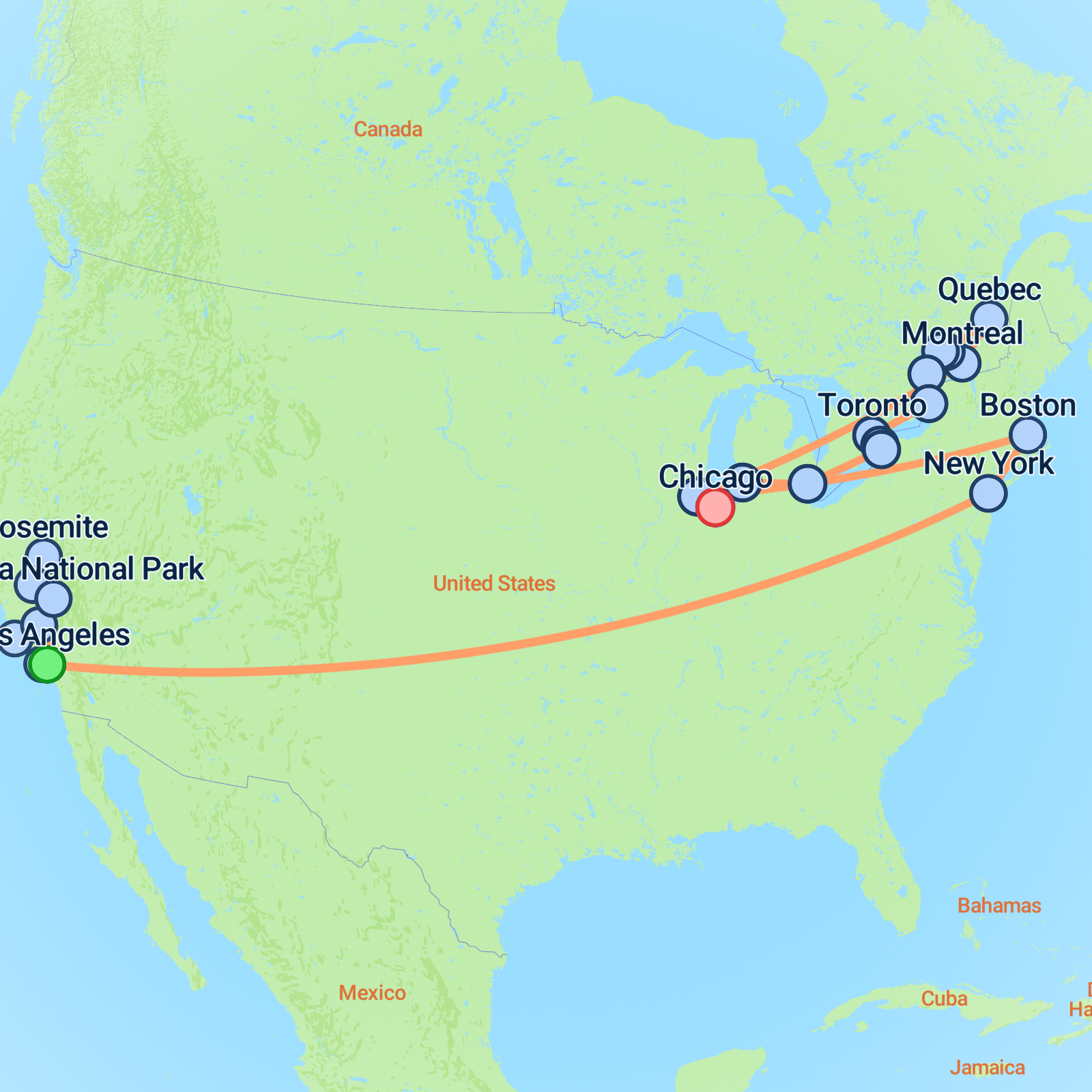 Embark on an extraordinary 19-day journey from the sunny skies of Los Angeles to the iconic landscapes of Chicago. Kick off with Hollywood glamour in LA, and marvel at the coastal views in Santa Monica. Delight in the quirky charm of Solvang and stand in awe at Yosemites majestic El Capitan. As we traverse the US and Canada, explore vibrant New York, revolutionary Boston, and picturesque Quebec. Experience Torontos urban buzz before the thunderous spectacle of Niagara Falls. Conclude with a vibrant exploration of Chicago, visiting Millennium Park and Navy Pier. This tour offers a delightful mix of nature, history, and urban adventures.