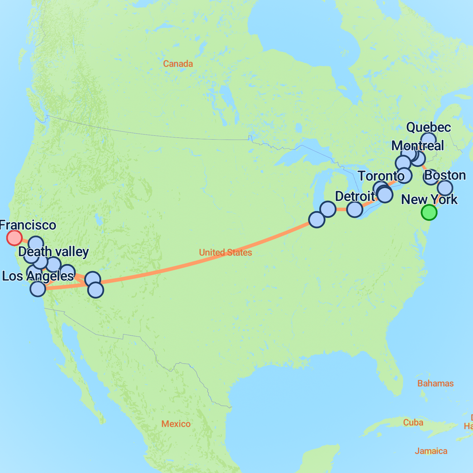 Embark on an unforgettable 23-day journey from the bustling streets of New York to the beautiful bay of San Francisco. Kick things off with the iconic sights of New York before heading to historic Boston. Experience the charm of Canada's Montreal and Quebec, then dive into the serene Canadian landscapes of the Thousand Islands. Discover the dynamic cityscapes of Toronto and marvel at the power of Niagara Falls. Cross back into the US and enjoy the urban buzz of Chicago, LA's Hollywood glamour, and the vibrant nightlife of Las Vegas. Conclude with the natural wonders of the Grand Canyon, Death Valley, and Yosemite. This tour blends urban escapades with breathtaking natural sites.