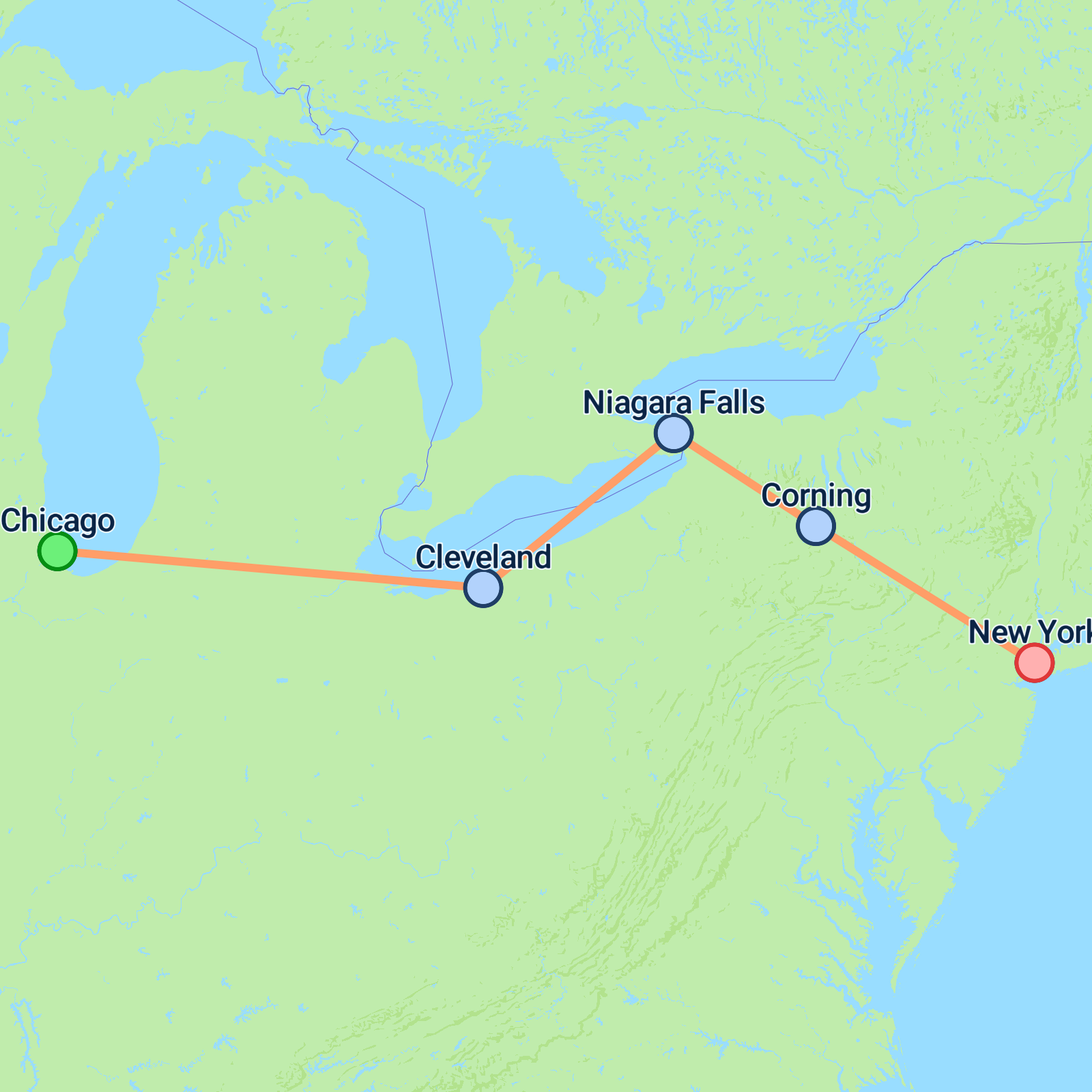 Embark on an exhilarating 8-day journey starting in the dynamic city of Chicago and concluding in the vibrant metropolis of New York City. Your adventure kicks off with Chicagos architectural wonders, including The Loop and Navy Pier. In Cleveland, immerse yourself in the city's rich culture before heading to the iconic Niagara Falls for breathtaking views and a thrilling Maid of the Mist boat ride. Discover Cornings glass treasures en route to the Big Apple. In New York, stroll through iconic districts like Wall Street and Central Park, and soak up the electric atmosphere of Times Square. Expect diverse experiences and unforgettable moments.