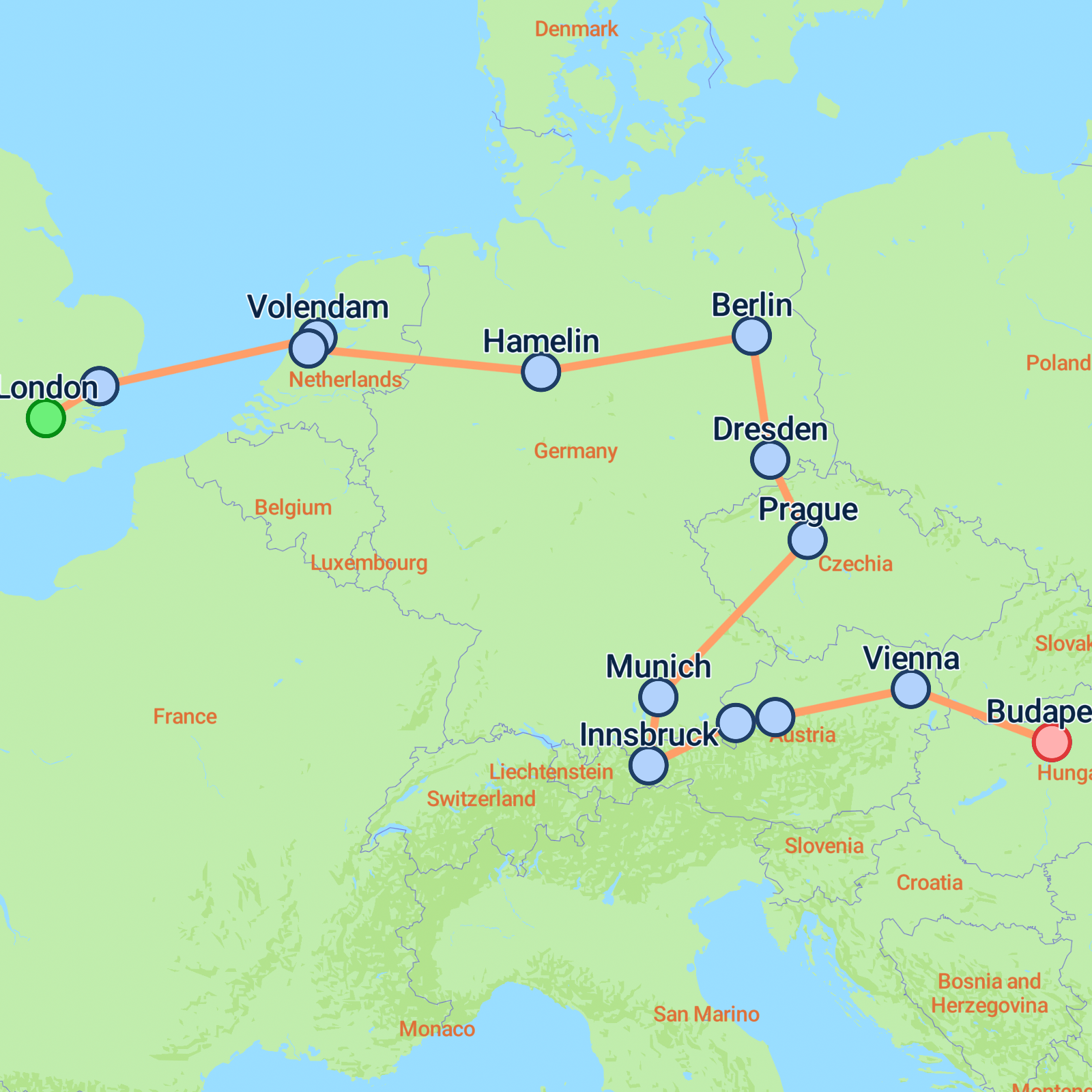 Embark on a captivating 14-day escapade from vibrant London to the historic splendor of Budapest. Kick off in London with explorations of Buckingham Palace and lively Soho. Hop over to the Netherlands to savour Volendam's charm and Amsterdam's cultural treasures. In Germany, discover Berlin's poignant history and Dresden's architectural brilliance before soaking up Prague's Baroque beauty. Cross into Bavaria for Munich's vibrant allure, then head to Austria to marvel at Salzburg's musical heritage and Vienna's grand avenues. Conclude alongside the Danube in Budapest, a city of timeless elegance and energetic vibe. Expect a blend of culture, history, and stunning scenery throughout.