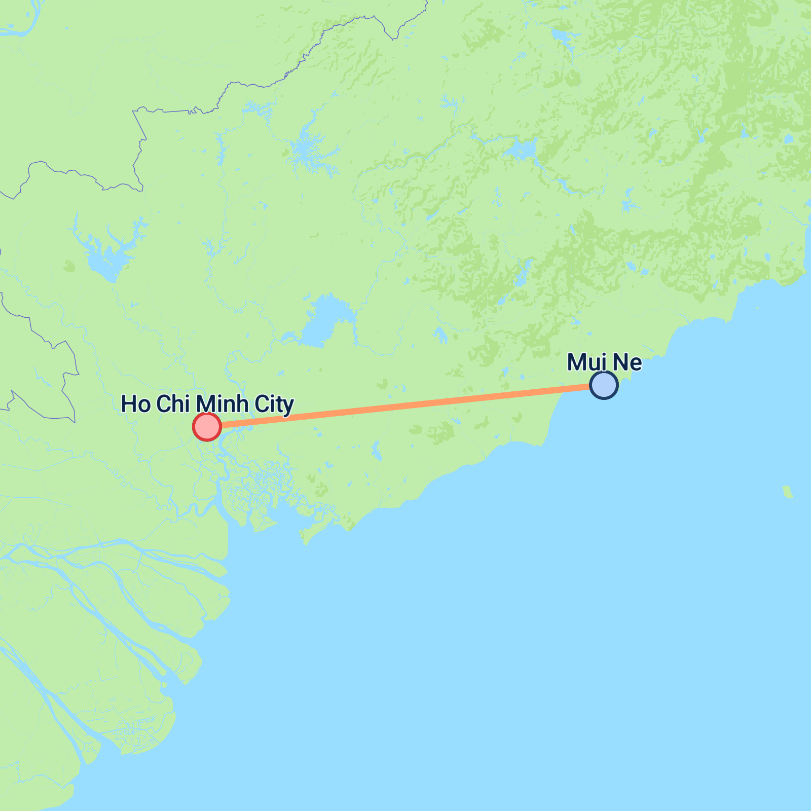 Ho Chi Minh City - Mui Ne. It's time to leave Saigon as you are transferred to the beach resort of Mui Ne, famous for its sprawling sand dunes. The journey takes around 3.5 - 4 hours, and you will check in to your hotel on arrival.